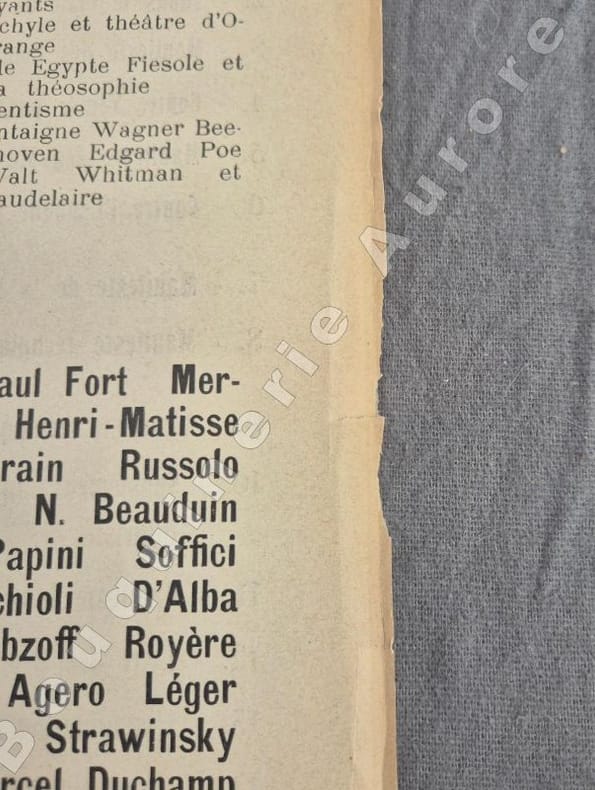 14e manifeste du Mouvement Futuriste créé par Marinetti. Celui-ci est rédigé par Guillaume Apollinaire qui fit une brève apparition dans ce mouvement. Il nest pas très loin dans sa mise en page de ses futurs Calligrammes.Exemplaire provenant de la Bibliothèque personnelle dApollinaire avec son cachet humide bleu apposé dans le coin inférieur droit de la première page (serpent enroulé sur une flèche tenant une fleur dans sa gueule, initiales G & A, le tout dans un écu).