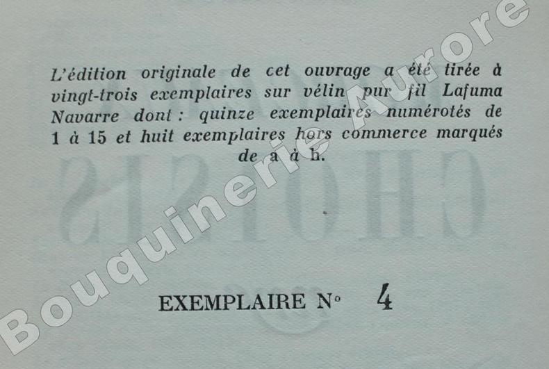 Edition originale de ce choix de textes 1 des 23 exemplaires sur vélin pur fil Lafuma-Navarre, seul grand papier (N°4).Extrait de la dédicace imprimée : "Monsieur Paul petit, de la Légation de France au Danemark, a bien voulu extraire les moins mauvaises pages de mes oeuvres pour en composer l'anthologie qu'on va lire...".