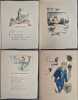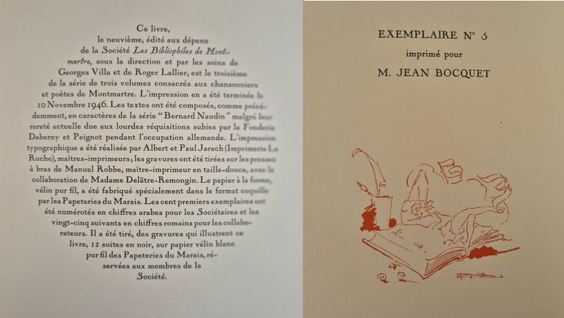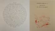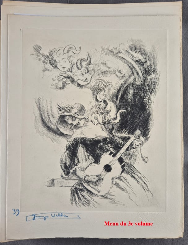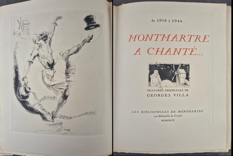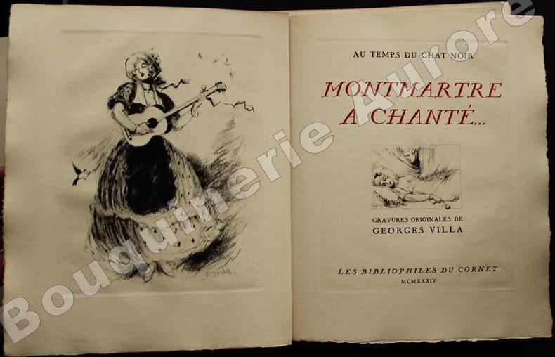 Edition originale des trois volumes consacrés au Montmartre chansonnier et poète, la réunion des trois volumes étant des plus rares (12 ans se sont écoulés entre le 1e et le 3e). Préface de Xanrof dans le 1e volume, de George Chepfer dans le 2e, et de Valentin Tarault dans le 3e.Illustrations de Georges Villa, gravées sur cuivre par lui-même et tirées sur les presses à bras d'Eugène Delâtre, maître imprimeur pour le 1e vol., Paul Haasen, pour le 2e, et Manuel Robbe pour le 3e.- 1e volume : 8 poèmes et douze chansons avec musique notée : Vignette en rouge au justificatif, eau-forte en noir en frontispice, vignette coloriée à la page de titre, 22 entêtes et 19 culs-de-lampe gravés à leau-forte en noir (dont 6 à pleine page), 19 hors-textes et 1 grand in-texte gravés à l'eau-forte en couleurs, 20 petites vignettes en couleurs sur les titres des chansons et nombreuses lettrines mises en couleurs dans les ateliers de Charpentier.Tirage à 175 exemplaires, tous sur vélin royal de Viladon, 1 des 150 premiers réservés aux sociétaires, ici le N°117 imprimé pour le Docteur Jacques Ramadier.- 2e volume : 1 monologue, 5 poèmes et 8 chansons avec musique notée : Vignette en rouge au justificatif, eau-forte en noir en frontispice, vignette en noir à la page de titre, 16 entêtes gravés à l'eau-forte en noir, 15 hors-textes et 1 pleine page gravés à l'eau-forte en couleurs, 1 pleine page gravée à l'eau-forte en noir, 15 petites vignettes en couleurs sur les titres des chansons et nombreux culs-de-lampe et lettrines mis en couleurs dans les ateliers de Charpentier.Tirage à 150 exemplaires, tous sur vélin royal de Viladon, 1 des 250 premiers réservés aux sociétaires, ici le N°111.- 3e volume : 4 monologues, 2 poèmes et 7 chansons avec musique notée : Vignette en rouge au justificatif, eau-forte en noir en frontispice, vignette coloriée à la page de titre, 13 entêtes, 13 hors-textes, 13 culs-de-lampe tous gravés à l'eau-forte en couleurs, 13 petites vignettes en noir sur les titres des chansons, 1 vignette en noir dans le texte et un entête en noir à la page de table.Tiré à 125 exemplaires sur papier à la forme, vélin pur fil des Papeteries du Marais, ici le N°5 des 100 exemplaires réservés aux sociétaires, celui-ci l'exemplaire nominatif de Jean Bocquet.Il est joint : 1e volume :- Le Menu des Bibliophiles du Cornet, illustré d'une eau-forte de Georges Villa, au Restaurant de l'Ecrevisse, le 24 octobre 1934- Une aquarelle originale de Georges Villa, « La Pastourelle Poitevine », dimensions 72 x 72 mm sur feuille cartonnée 223 x 177 mm, protégée par un calque, titre au crayon et 4 lignes du texte de la chanson manuscrits en marge, reproduite en cul-de-lampe de cette chanson dans l'ouvrage.2e volume : - Le Menu des Bibliophiles de Montmartre, illustré d'une eau-forte de Georges Villa, à l'Hôtel-Restaurant du Printemps, le 30 mai 1938.3e volume : - Le Menu des Bibliophiles de Montmartre, illustré d'une eau-forte en noir de Georges Villa - numéroté "39" et signé au crayon bleu par l'artiste - au Restaurant "Chez Ploquin", le 15 janvier 1947.A notre goût, la plus belle réalisation de l'artiste !Réf. biblio. : Carteret, IV-291 (paru en 1948, il ne cite que les 2 premiers volumes) : « Très intéressante publication rare et cotée » ; Monod, 8425 (ne cite aussi que les 2 premiers volumes !).