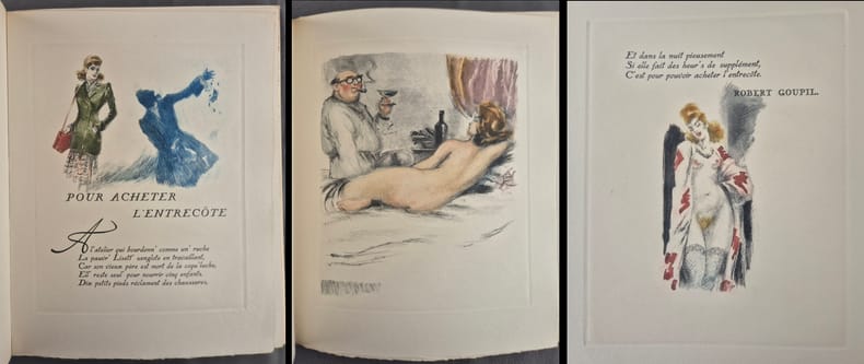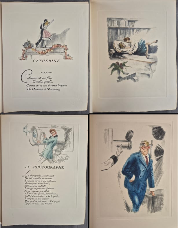 1934-1946 P., Les Bibliophiles du Cornet, Les Bibliophiles de Montmartre, 1934, 1937 et 1946, 3 vol. in-4° (285 x 240 mm pour les 2 premiers et 285 x 220 mm pour le 3e) en feuilles sous couvertures rempliées crème imprimées en noir, chemises et étuis cartonnés fleuris, non paginés.Chemises et étuis usagés, petites rousseurs en tranches des 2e premiers volumes, quelques rousseurs marginales dans le 2e volume, dos du 3e vol. légèrement insolé, très beaux exemplaires par ailleurs.