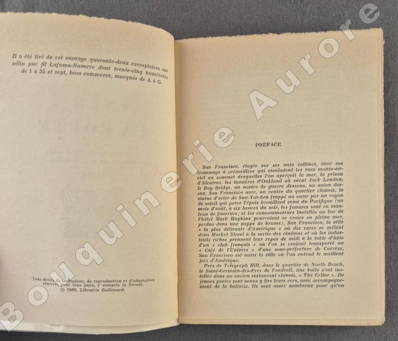 Collection "Du monde entier", traduit de l'américain par Jacques Houbard, préface de Michel Mohrt.Première édition française sur papier courant, après seulement 42 ex. numérotés sur pur fil, de cet ecrit emblématique de la Beat Generation.Rare, surtout dans cet état.