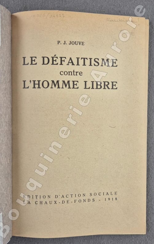 La Chaux-de-Fonds, Edition d'Action Sociale, 1918, 1 plaquette in-12 (190 x 125 mm) brochée sous couverture grise imprimée en noir, de 56 pp.Papier très légèrement jauni, très bel exemplaire.