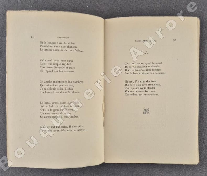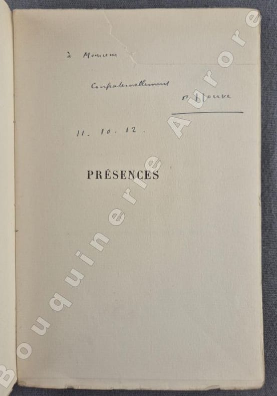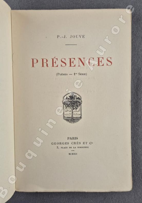 Edition originale tirée à 512 exemplaires numérotés, 1 des 500 sur vergé anglais (N°145).Envoi autographe signé de l'auteur en page de faux-titre, malheureusement, le nom du dédicataire ayant été découpé : "A Monsieur..., Confraternellement, P J Jouve 11.10.12".Comme tous ses premiers écrits, Pierre Jean Jouve reniera par la suite cet ouvrage.Réf. biblio. : Talvart & Place, T.IX, p.190.