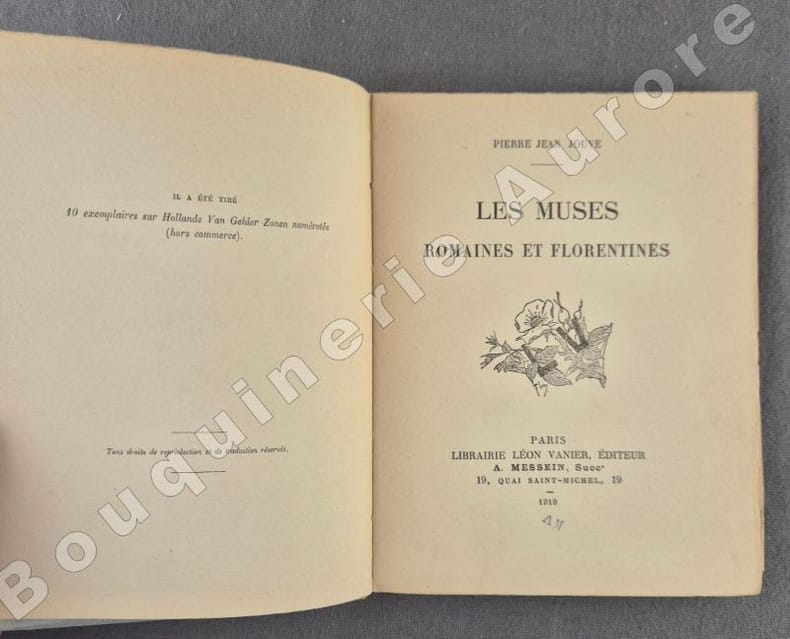 Rare édition originale du premier ouvrage de Jouve.Exemplaire sur papier courant, beau papier vélin très épais, après seulement 10 ex. sur Hollande Van Gelder Zonen.Comme tous ses premiers écrits, Pierre Jean Jouve reniera par la suite cet ouvrage.Réf. biblio. : Talvart & Place, T.IX, p.190.