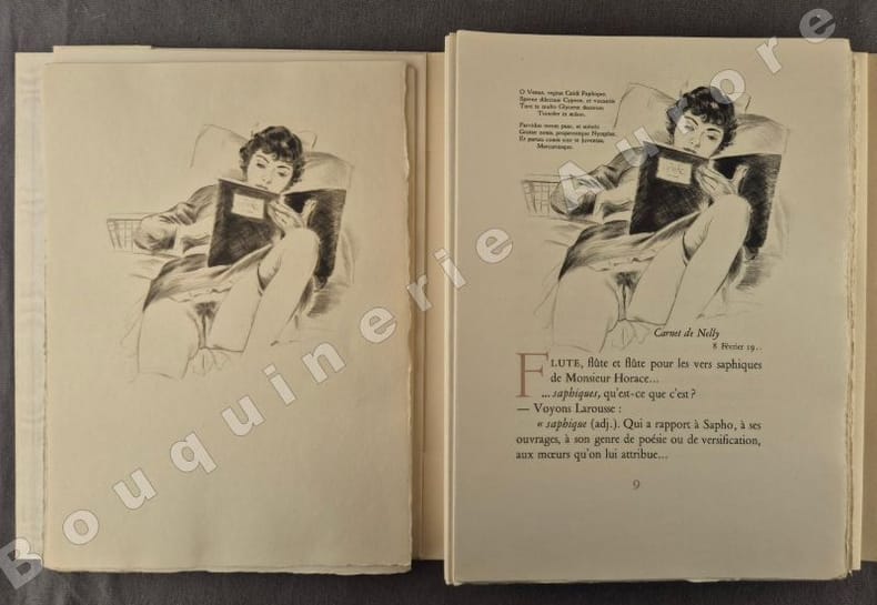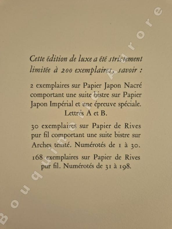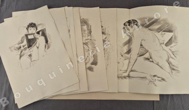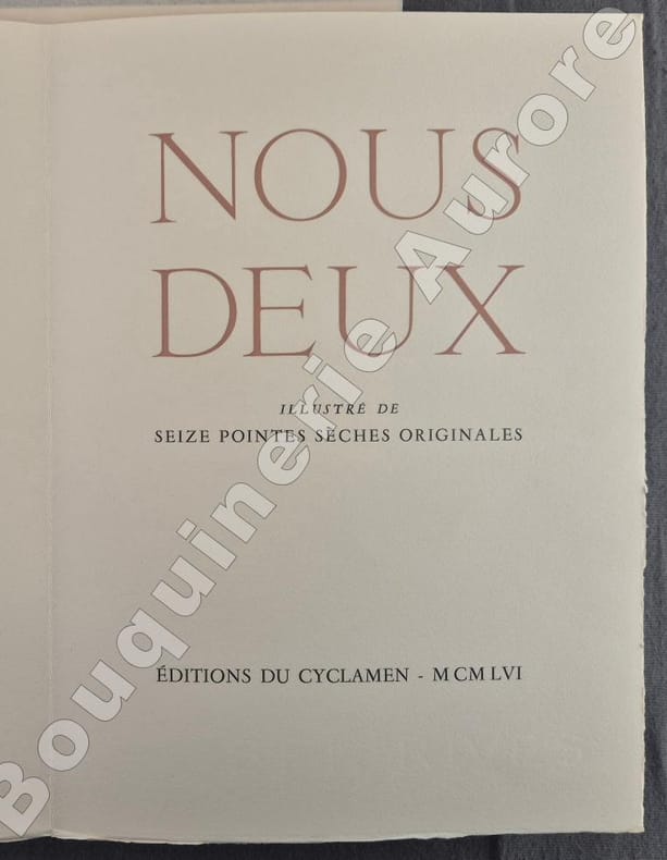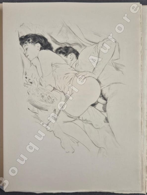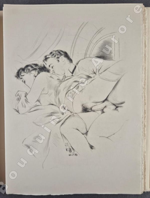 16 pointes sèches originales anonymes très libres, dont 12 hors texte, elles sont dues à Gaston de Sainte Croix.Tiré à 200 exemplaires numérotés (2 sur Japon Nacré et 198 sur papier de Rives pur fil), 1 des 30 premiers du papier de Rives pur fil (N°19) comportant une suite bistre sur Arches teinté placée dans une chemise à part. L'édition originale de ce roman est parue sous le titre de "Nelly & Jean, Nous deux, simples papiers du tiroir secret" en 1929. Très rare avec suite.Réf. biblio. : Dutel, 2055 : " Edition publiée en 1956, probablement par Vialetay. Elle est ornée de 16 superbes pointes sèches, dont 12 hors texte, de Gaston de Sainte Croix, qui furent tirées chez Georges Viglino ".