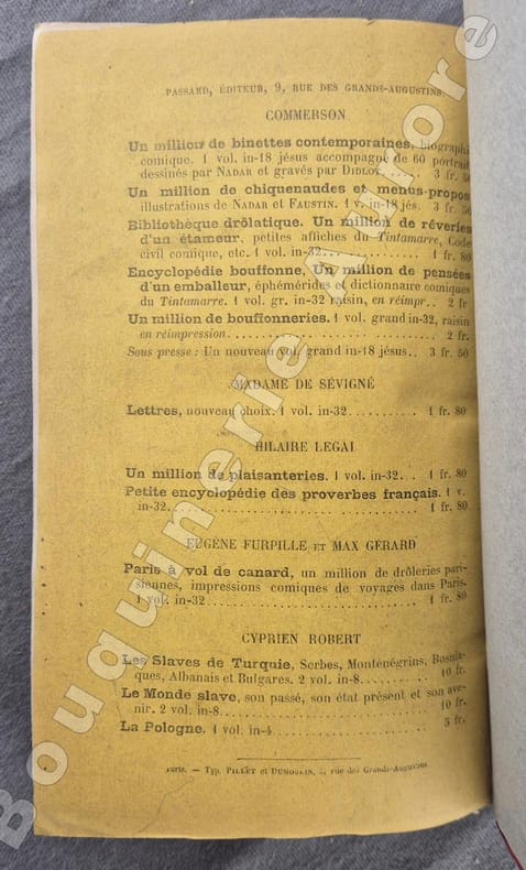 1882 P., Passard, s.d. (1882), 1 vol. in-12 (192 x 115 mm) relié 1/2 toile rouge à la Bradel, titre et jeux de filets dorés au dos, plats de papier marbré rouge et bleu, couvertures jaunes conservées, de (4) ff. (faux-titre, portrait de l'auteur, titre et table) - 416 pp. - (4) ff. (catalogue de l'éditeur).Ancien ajout de papier en page de titre et en bas de la page 100 pour dissimuler un cachet, bel exemplaire par ailleurs.