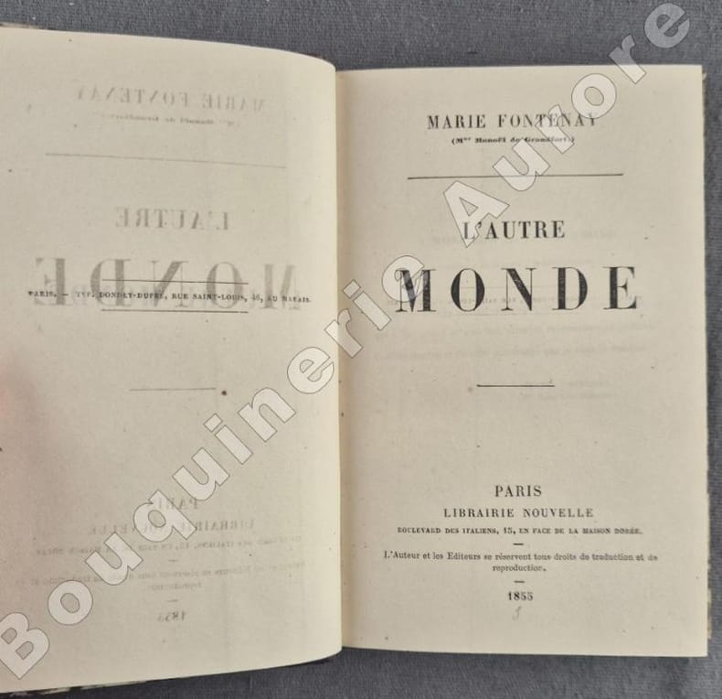 1855 P., Librairie Nouvelle, 1855, 1 vol. in-16 (160 x 100 mm) relié 1/2 chagrin marron d'époque, dos à nerf, auteur et titre dorés, plats de papier marbré marron, de (4) ff. (faux-titre, titre, dédicace à Drummond, Ministre de la Justice à Québec (Canada), 3 citations) - 259 pp. - (1) f. (table).Dos très légèrement insolé, très bel exemplaire sans rousseurs par ailleurs.