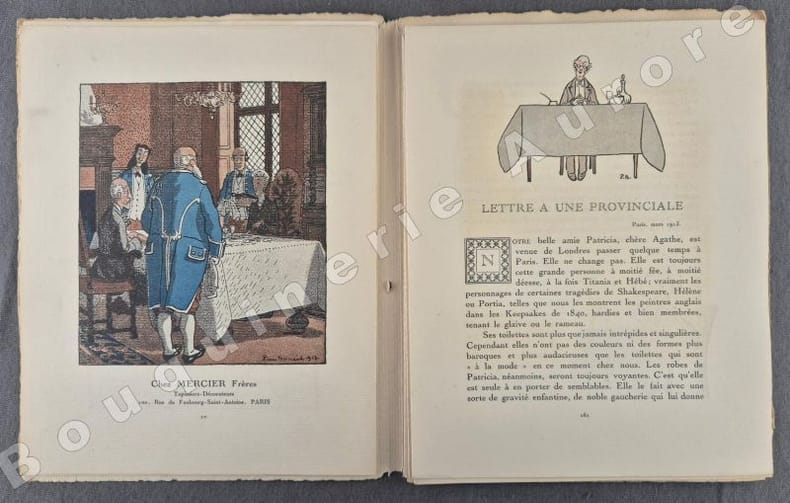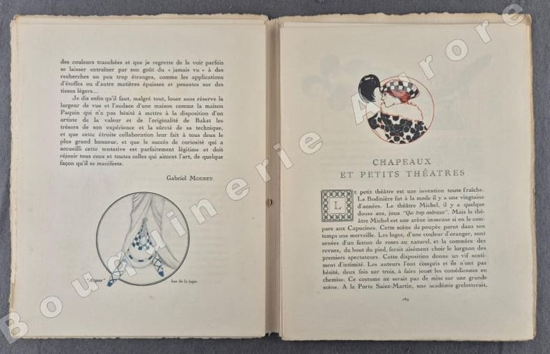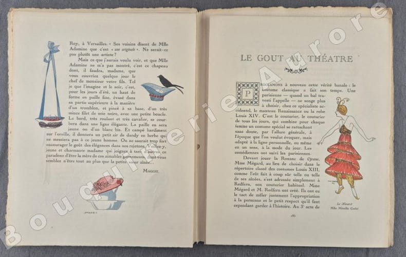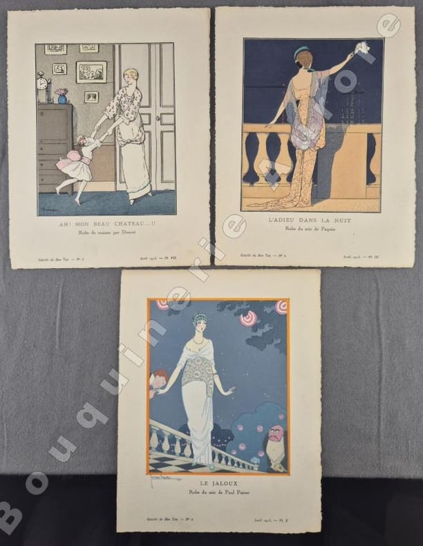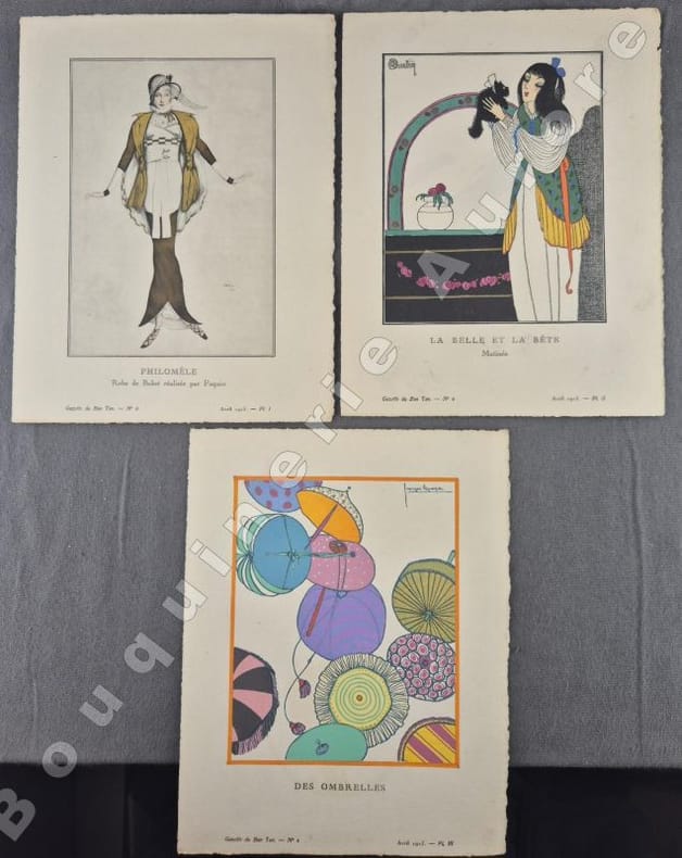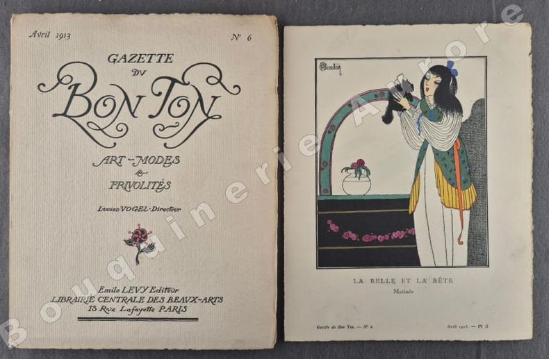10 planches hors texte (pl. I à X), coloriées au pochoir de Léon BAKST - Charles MARTIN - Georges LEPAPE (2) - Javier GOSE - Fabius LORENZI - Pierre BRISSAUD - Louis STRIMPL - DRESA - André E. MARTY.Les pages publicitaires contiennent : Eau de jeunesse Jane Hading (ill. Marty) - V. Darcy (ill. Georges Lepape) - Automobiles Panhard & Levassor (ill. Lepape) - Hôtel Westminster + 2 illustrations en couleurs à pleine page : Chez Mercier ill. par Pierre Brissaud - La malle de voyage Sormani (ill. Georges Lepape).Articles illustrés en couleurs: - Lettre à une provinciale (texte de Jean-Louis Vaudoyer, dessins de Pierre Brissaud) - Les Robes de Bakst (Gabriel Mourey, Léon Bakst) - Chapeaux et petits théâtres (Henry Bidou, Paul Méras) - Alentours, pourtours & dessous (Emile Henriot, Charles Martin) - Du prestige de la mode aux Etats-Unis (André de Fouquières, Louis Strimpl) - Ombrelles (Nada, Georges Lepape) (transfert d'un ancien pochoir à la dernière page) - Mademoiselle Adamine, modiste (texte et dessins de Maggie Salzedo) - Le goût au théâtre (Lise-Léon Blum, José Zamore) - La mode et le bon ton - Explication des planches. Numéro rare, comme tous les premiers numéros."La Gazette du Bon Ton "Art, Modes & Frivolités" est une revue de mode fondée à Paris en 1912 par Lucien Vogel. Elle a paru jusqu'en 1925, avec une interruption de 1916 à 1920, soit 69 livraisons. Elle comprend 573 planches coloriées au pochoir et 148 croquis représentant des modèles de couturiers. Chaque fascicule constitue un album de luxe, imprimé sur beau papier en Cochin, caractère totalement nouveau à l'époque. De nombreux artistes y ont collaboré : Guy Arnoux, Léon Bakst, George Barbier, Benito, Pierre Brissaud, Bernard Boutet de Monvel, Umberto Brunelleschi, Chas Laborde, Jean-Gabriel Domergue, Raoul Dufy, Édouard Halouze, Alexandre Iacovleff, Jean Emile Laboureur, Georges Lepape, Charles Loupot, Charles Martin, André-Edouard Marty Ces artistes, inconnus pour la plupart lorsque Lucien Vogel fait appel à eux, imposeront une nouvelle image de la femme. Ils garderont de leur collaboration à cette revue un socle esthétique commun et exposeront leurs uvres sous le nom de Collaborateurs de la Gazette du bon ton. Les planches représentent les robes des créateurs de l'époque : Lanvin, Doeuillet, Paquin, Poiret, Worth, Vionnet, Doucet. Certaines planches ne figurent aucun modèle réel, mais seulement l'idée que l'illustrateur se fait de la mode du jour. [] La naissance de la Gazette du bon ton est un événement dans l'histoire de l'édition de mode. C'est la première revue qui allie souci esthétique, exigence de beauté et d'unité plastique." (Sources Wikipédia). Réf. biblio. : Colas 1202.