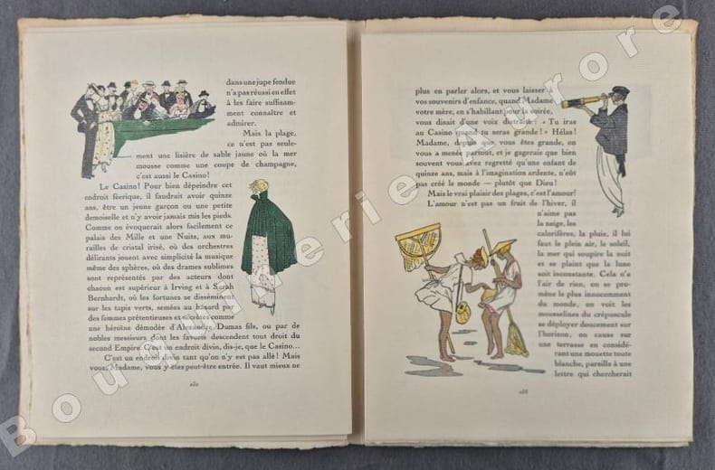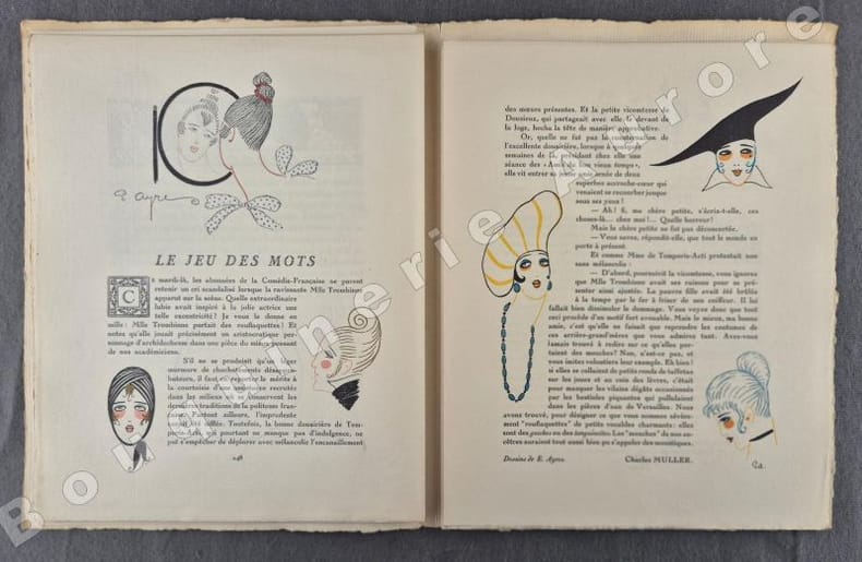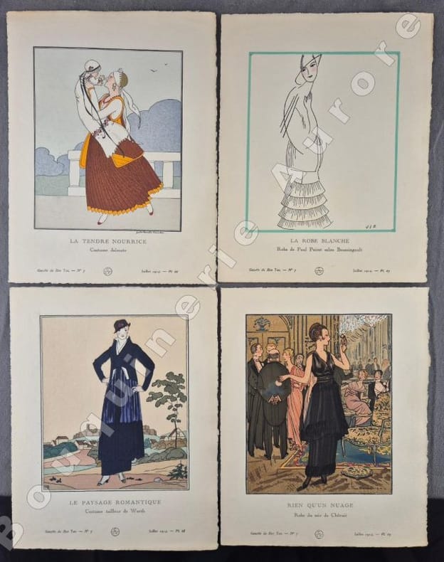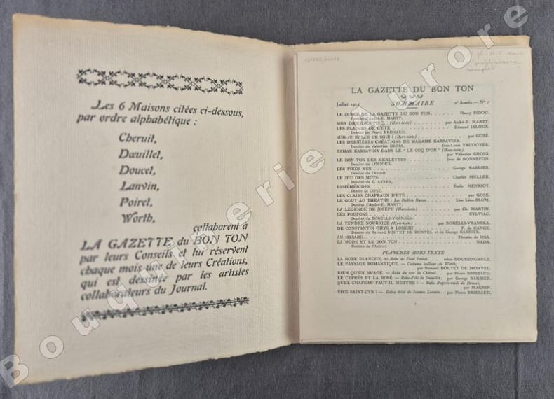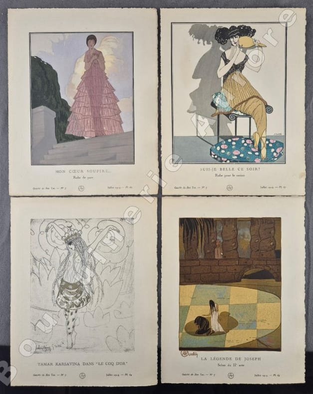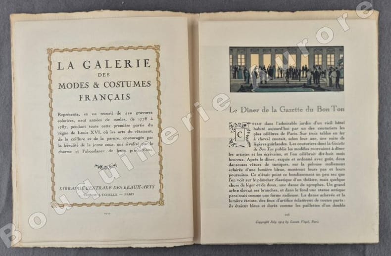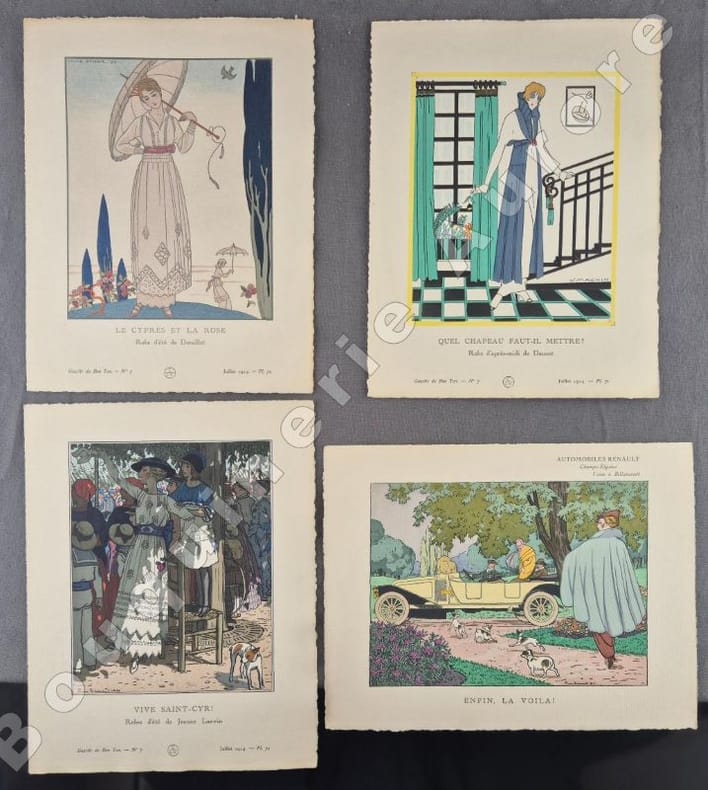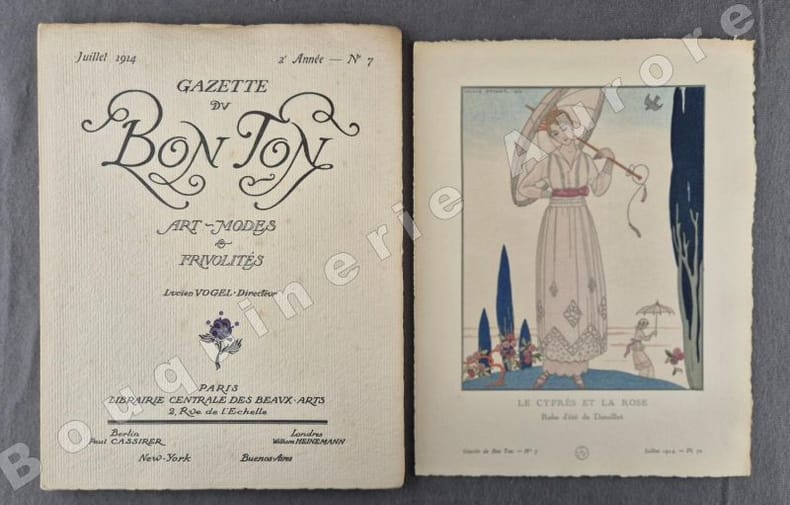 Numéro bien complet de ses 12 planches hors texte (pl. 62 à 72 + planche publicitaire), coloriées au pochoir, par George Barbier, Borelli-Vranska, Boussingault, Bernard Boutet de Monvel, Pierre Brissaud (3, y compris la planche publicitaire), Gosé, Valentine Gross, Magnin, Charles Martin et André-E. Marty, pour des créations de Renault, Paul Poiret, Worth, Chéruit, Doeuillet, Doucet et Jeanne Lanvin.Articles illustrés en couleurs: - Le dîner de la Gazette du Bon Ton, texte d'Henry Bidou, dessins d'André-E. Marty - Les plaisirs de l'été, texte d'Edmond Jaloux, dessins de Pierre Brissaud - Les dernières créations de Madame Karsavina, texte de Jean-Louis Vaudoyer, dessins de Valentine Gross - Le Bon Ton des Merlettes, texte de Jean de Bonnefon, dessins de Félix Lorioux - Les pieds nus, texte et dessin de George Barbier - Le jeu des mots, texte de Charles Muller, dessins de E. Ayres - Ephémérides, texte d'Emile Henriot, dessins de Gosé - Les clairs chapeaux d'été par Gosé - Le goût au théâtre, texte de Lise Léon-Blum, dessins d'André-E. Marty - Les poupons, texte de Sylviac, dessins de Borelli-Vranska - De Constantin Ghys à Longhi, texte de F. de Cance, dessins de Bernard Boutet de Monvel & George Barbier - Au Hasard, texte de Téresita de Osa - La mode et le Bon Ton, texte et dessins de Nada. Numéro bien complet et rare, comme tous les premiers numéros. "La Gazette du Bon Ton "Art, Goût, Beauté" est une revue de mode fondée à Paris en 1912 par Lucien Vogel. Elle a paru jusqu'en 1925, avec une interruption de 1916 à 1920, soit 69 livraisons. Elle comprend 573 planches coloriées au pochoir et 148 croquis représentant des modèles de couturiers. Chaque fascicule constitue un album de luxe, imprimé sur beau papier en Cochin, caractère totalement nouveau à l'époque. De nombreux artistes y ont collaboré : Guy Arnoux, Léon Bakst, George Barbier, Benito, Pierre Brissaud, Bernard Boutet de Monvel, Umberto Brunelleschi, Chas Laborde, Jean-Gabriel Domergue, Raoul Dufy, Édouard Halouze, Alexandre Iacovleff, Jean Emile Laboureur, Georges Lepape, Charles Loupot, Charles Martin, André-Edouard Marty Ces artistes, inconnus pour la plupart lorsque Lucien Vogel fait appel à eux, imposeront une nouvelle image de la femme. Ils garderont de leur collaboration à cette revue un socle esthétique commun et exposeront leurs uvres sous le nom de Collaborateurs de la Gazette du bon ton. Les planches représentent les robes des créateurs de l'époque : Lanvin, Doeuillet, Paquin, Poiret, Worth, Vionnet, Doucet. Certaines planches ne figurent aucun modèle réel, mais seulement l'idée que l'illustrateur se fait de la mode du jour. [] La naissance de la Gazette du bon ton est un événement dans l'histoire de l'édition de mode. C'est la première revue qui allie souci esthétique, exigence de beauté et d'unité plastique." (Sources Wikipédia). Réf. biblio. : Colas 1202.