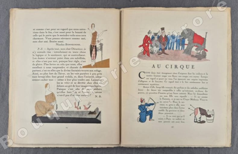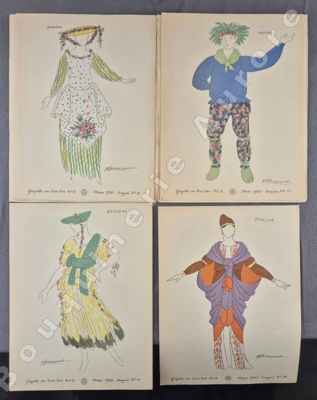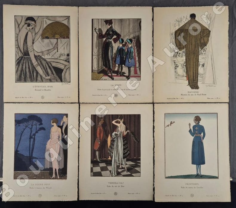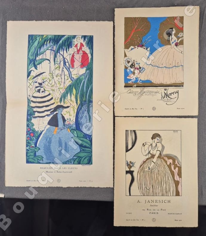 8 planches hors texte coloriées au pochoir par Robert Bonfils, Georges Lepape (Anthinéa, Manteau du soir de Paul Poiret, légèrement froissé en partie basse), Charles Martin, Bernard Boutet de Monvel (2), Pierre Brissaud (2) et André Marty pour des créations de Doeuillet, Jeanne Lanvin, Paul Poiret, Worth et Beer + 4 planches de croquis en couleurs par Mario Simon. Articles illustrés en couleurs : "La nature à Paris", texte de Marcel Astruc, dessins de Jeanne Dubouchet - "Première lettre à une élégante Marocaine" texte de El Veey, dessins de Boutet de Monvel - "Le chant du Rossignol" par Charles Martin, décor de Matisse - "Kees Van Dongen" par Jean-Louis Vaudoyer, croquis de Van Dongen - "La mode et l'histoire", Henriot, Bonfils - "Elles se maquillent, elles ont raison", Sylviac, Maggie Salzedo - "Robes de l'été", Georges-Armand Masson, Mario Simon - "Les trois noblesses de la Chambre", Jean Bonnefon, Félix Lorioux - "Voilettes", Nicolas Bonnechose, Bénito. "La Gazette du Bon Ton "Art, Goût, Beauté" est une revue de mode fondée à Paris en 1912 par Lucien Vogel. Elle a paru jusqu'en 1925, avec une interruption de 1916 à 1920, soit 69 livraisons. Elle comprend 573 planches coloriées au pochoir et 148 croquis représentant des modèles de couturiers. Chaque fascicule constitue un album de luxe, imprimé sur beau papier en Cochin, caractère totalement nouveau à l'époque. De nombreux artistes y ont collaboré : Guy Arnoux, Léon Bakst, George Barbier, Benito, Pierre Brissaud, Boutet de Monvel, Umberto Brunelleschi, Chas Laborde, Jean-Gabriel Domergue, Raoul Dufy, Édouard Halouze, Alexandre Iacovleff, Jean Emile Laboureur, Georges Lepape, Charles Loupot, Charles Martin, André-Edouard Marty Ces artistes, inconnus pour la plupart lorsque Lucien Vogel fait appel à eux, imposeront une nouvelle image de la femme. Ils garderont de leur collaboration à cette revue un socle esthétique commun et exposeront leurs uvres sous le nom de Collaborateurs de la Gazette du bon ton. Les planches représentent les robes des créateurs de l'époque : Lanvin, Doeuillet, Paquin, Poiret, Worth, Vionnet, Doucet. Certaines planches ne figurent aucun modèle réel, mais seulement l'idée que l'illustrateur se fait de la mode du jour. [...] La naissance de la Gazette du bon ton est un événement dans l'histoire de l'édition de mode. C'est la première revue qui allie souci esthétique, exigence de beauté et d'unité plastique." (Sources Wikipédia).