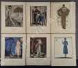 9 planches hors texte (pl. 56 à 63 & une non numérotée (Publicité illustrée par Félix Lorioux pour l'Essence Mystérieuse Mormy)), coloriées au pochoir, de Bénito, Bernard Boutet de Monvel, Charles Martin (2),Pierre Brissaud (2), Jean-Gabriel Domergue et Drian, pour des créations de Rodier, Becker et fils, Paul Poiret, Worth, Beer, Doeuillet et Jeanne Lanvin + 4 planches de croquis par Raoul Dufy sous cahier titré "Toiles de Tournon, Lampas, Brocarts et Brocatelles dessinés par Raoul Dufy éxécutés par Bianchini et Férier".Les pages publicitaires contiennent : Coiffures par Emile Ltd - Produits du Dr Dys Darcy - Mercie Mc Hardy - Ameublements Mercier Frères (ill. Edouard Halouze) - Barclay - Fourrure de Weil - Mappin & Webb - Verlaine (Chapeaux) - Zanesich Joallier (illustration pleine page non signée mais dans l'esprit de Charles Martin) - Técla 'illustration à pleine page très visuelle signée Charlotte Frappa (?)).Articles illustrés en couleurs: - Voyage autour de mon assiette (texte de Georges Armand Masson - dessins de Jeanne Dubouchet) - La fourrure déguisée (Marcel Astruc - Charles Martin) - Néo-Hellénisme (Robert Burnand - Pierre Brissaud) - Deuil (Roger et Bernard Boutet de Monvel) - Inspirations et Reflets (Célio - Mario Simon) - Pour bercer votre amie ayant le coeur en peine (Eugène Marsan - Borelli-Alacevich) - L'histoire des Favoris (Capitaine George Cecil - Charles Martin) - Vite ! une écharpe (Nicolas Bonnechose - Zinoview). Bien complet du rare supplément de 4 ff. intitulé "Défense de la Mode" par Paul Poiret."La Gazette du Bon Ton "Art, Modes & Frivolités" est une revue de mode fondée à Paris en 1912 par Lucien Vogel. Elle a paru jusqu'en 1925, avec une interruption de 1916 à 1920, soit 69 livraisons. Elle comprend 573 planches coloriées au pochoir et 148 croquis représentant des modèles de couturiers. Chaque fascicule constitue un album de luxe, imprimé sur beau papier en Cochin, caractère totalement nouveau à l'époque. De nombreux artistes y ont collaboré : Guy Arnoux, Léon Bakst, George Barbier, Benito, Pierre Brissaud, Bernard Boutet de Monvel, Umberto Brunelleschi, Chas Laborde, Jean-Gabriel Domergue, Raoul Dufy, Édouard Halouze, Alexandre Iacovleff, Jean Emile Laboureur, Georges Lepape, Charles Loupot, Charles Martin, André-Edouard Marty Ces artistes, inconnus pour la plupart lorsque Lucien Vogel fait appel à eux, imposeront une nouvelle image de la femme. Ils garderont de leur collaboration à cette revue un socle esthétique commun et exposeront leurs uvres sous le nom de Collaborateurs de la Gazette du bon ton. Les planches représentent les robes des créateurs de l'époque : Lanvin, Doeuillet, Paquin, Poiret, Worth, Vionnet, Doucet. Certaines planches ne figurent aucun modèle réel, mais seulement l'idée que l'illustrateur se fait de la mode du jour. [...] La naissance de la Gazette du bon ton est un événement dans l'histoire de l'édition de mode. C'est la première revue qui allie souci esthétique, exigence de beauté et d'unité plastique." (Sources Wikipédia). Réf. biblio. : Colas 1202.