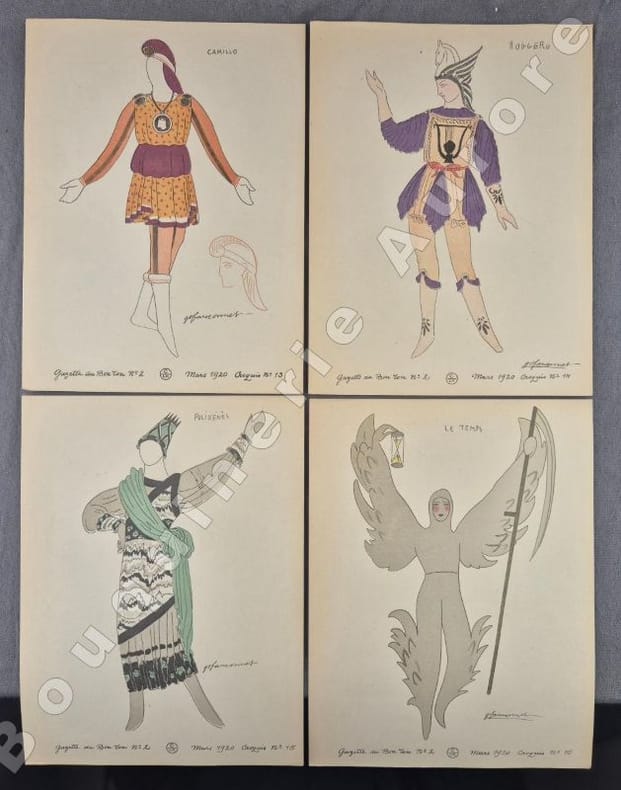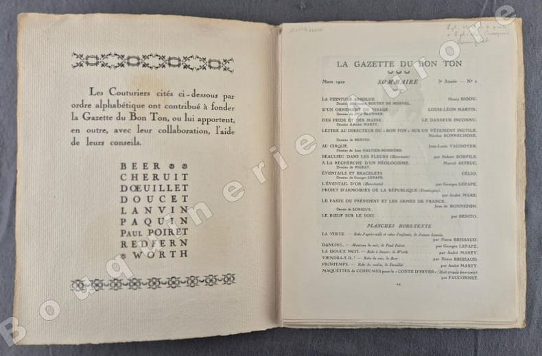 8 planches hors texte coloriées au pochoir par Pierre Brissaud (3), Maurice Leroy, Zinoview, André Marty, Georges Lepape et Drian, pour des créations de Doeuillet, Jeanne Lanvin, Paul Poiret, Worth et Beer + 4 planches, croquis en couleurs par Francis Jourdain. Articles illustrés en couleurs : "L'Age du Laque", texte de Henri Duvernois, dessins de Charles Martin - "Ah, mon beau chateau", Emile Henriot, Pierre Brissaud - "Les marchandes d'espoir", Sylviac, Martin - "L'impossible hallali", P.L., Eyre de Lanux - "Héraldique d'Angleterre", Jean de Bonnefon, Félix Lorioux et Catti - "Djersador d'Ispahal", Célio, Siméon - "Le divan de Véronique", Louis-Léon Martin, Robert Polack - "Avênement des Amazones", Mayotte, Bénito. Timbre humide d'appartenance (illisible en haut de la page de sommaire."La Gazette du Bon Ton "Art, Goût, Beauté" est une revue de mode fondée à Paris en 1912 par Lucien Vogel. Elle a paru jusqu'en 1925, avec une interruption de 1916 à 1920, soit 69 livraisons. Elle comprend 573 planches coloriées au pochoir et 148 croquis représentant des modèles de couturiers. Chaque fascicule constitue un album de luxe, imprimé sur beau papier en Cochin, caractère totalement nouveau à l'époque. De nombreux artistes y ont collaboré : Guy Arnoux, Léon Bakst, George Barbier, Benito, Pierre Brissaud, Boutet de Monvel, Umberto Brunelleschi, Chas Laborde, Jean-Gabriel Domergue, Raoul Dufy, Édouard Halouze, Alexandre Iacovleff, Jean Emile Laboureur, Georges Lepape, Charles Loupot, Charles Martin, André-Edouard Marty Ces artistes, inconnus pour la plupart lorsque Lucien Vogel fait appel à eux, imposeront une nouvelle image de la femme. Ils garderont de leur collaboration à cette revue un socle esthétique commun et exposeront leurs uvres sous le nom de Collaborateurs de la Gazette du bon ton. Les planches représentent les robes des créateurs de l'époque : Lanvin, Doeuillet, Paquin, Poiret, Worth, Vionnet, Doucet. Certaines planches ne figurent aucun modèle réel, mais seulement l'idée que l'illustrateur se fait de la mode du jour. [...] La naissance de la Gazette du bon ton est un événement dans l'histoire de l'édition de mode. C'est la première revue qui allie souci esthétique, exigence de beauté et d'unité plastique." (Sources Wikipédia).