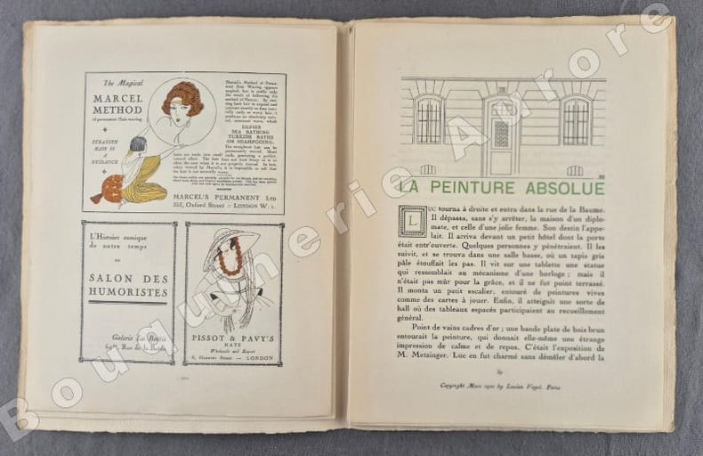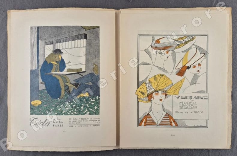 8 planches hors texte (pl. 32 à 39), coloriées au pochoir, de Bénito, L'Hom, Siméon, Pierre Brissaud (2), André-Edouard Marty, Georges Lepape et Bernard Boutet de Monvel, pour des créations de Paul Poiret, Worth, Doeuillet, Beer, Jeanne Lanvin + 4 planches de croquis par Süe et Mare sous cahier titré "Aménagement d'une Loge d'Actrice par Süe & Mare exécuté par La Compagnie des Arts Français". Les pages publicitaires contiennent : Coiffures par Emile Ltd - Produits du Dr Dys Darcy - Fourrures Weil (illustration pleine page non signée mais dans l'esprit de Charles Martin) - Chez Mercier (illustration pleine page monogrammée) - Eugène de Londres (illustration à pleine page non signée) - Mappin & Webb (illustration à pleine page signée Edouard Halouze) - Mercie Mc Hardy (illustration à pleine page monogrammée M. R. (Romme)) - Técla 'illustration à pleine page très visuelle monogrammée EX).Articles illustrés en couleurs: - Rêveries sur un paysage (Texte d'Emile Henriot - dessins de Laboureur) - Les beaux bas (Eugène Marsan - Bénito) - Du sable, de la volupté, de la mer (Gérard Bauër - Robert Bonfils) - Bijouterie Fétichiste (Jean Bernier - Roger Roy) - Modes Tchéco-Slovaques (Nicolas Boonnechose - L'Hom) - Transparences (Marcel Astruc - Mario Simon) - Spectacles (Jacques Porel - Marty) - Fenêtres et crevés (Georges-Armand Masson - Jaques). "La Gazette du Bon Ton "Art, Modes & Frivolités" est une revue de mode fondée à Paris en 1912 par Lucien Vogel. Elle a paru jusqu'en 1925, avec une interruption de 1916 à 1920, soit 69 livraisons. Elle comprend 573 planches coloriées au pochoir et 148 croquis représentant des modèles de couturiers. Chaque fascicule constitue un album de luxe, imprimé sur beau papier en Cochin, caractère totalement nouveau à l'époque. De nombreux artistes y ont collaboré : Guy Arnoux, Léon Bakst, George Barbier, Benito, Pierre Brissaud, Bernard Boutet de Monvel, Umberto Brunelleschi, Chas Laborde, Jean-Gabriel Domergue, Raoul Dufy, Édouard Halouze, Alexandre Iacovleff, Jean Emile Laboureur, Georges Lepape, Charles Loupot, Charles Martin, André-Edouard Marty Ces artistes, inconnus pour la plupart lorsque Lucien Vogel fait appel à eux, imposeront une nouvelle image de la femme. Ils garderont de leur collaboration à cette revue un socle esthétique commun et exposeront leurs uvres sous le nom de Collaborateurs de la Gazette du bon ton. Les planches représentent les robes des créateurs de l'époque : Lanvin, Doeuillet, Paquin, Poiret, Worth, Vionnet, Doucet. Certaines planches ne figurent aucun modèle réel, mais seulement l'idée que l'illustrateur se fait de la mode du jour. [...] La naissance de la Gazette du bon ton est un événement dans l'histoire de l'édition de mode. C'est la première revue qui allie souci esthétique, exigence de beauté et d'unité plastique." (Sources Wikipédia). Réf. biblio. : Colas 1202.