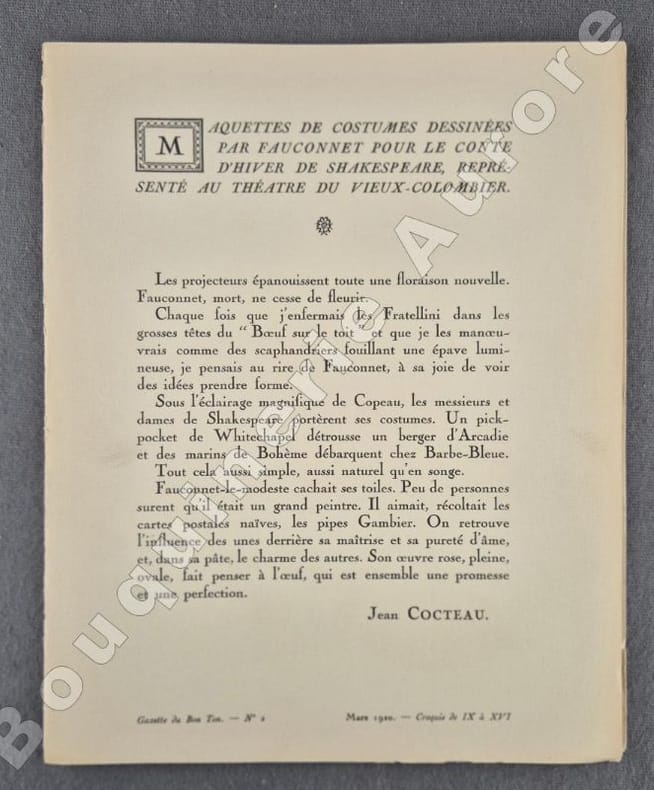 1920 P., Edition Lucien Vogel, 1920, 1 vol. in-8 (245 x 198) en feuilles sous couverture imprimée en noir, de (4) ff. (sommaire & publicités paginés IX à XVI) - 2 planches publicitaires H.T. - 32 pp. (paginées de 37 à 68) - 7 planches H.T. (Pl. 9 à 15) - 1 cahier titré "Maquettes de costumes dessinées par Fauconnet pour le conte d'hiver de Shakespeare, représenté au Théâtre du Vieux-Colombier" contenant 8 planches couleurs numérotées de IX à XVI, texte de Jean Cocteau. Dos légèrement poussiéreux, rares rousseurs en couverture, très bel exemplaire.