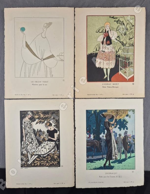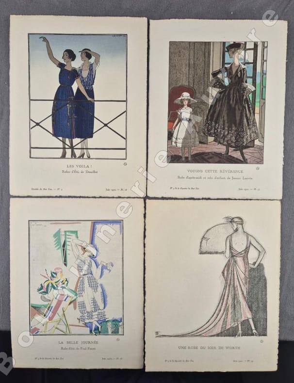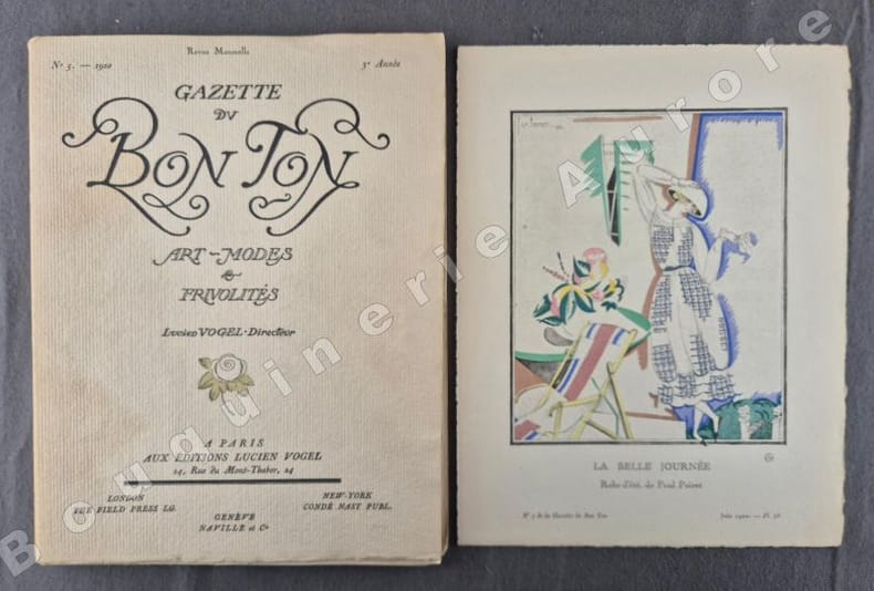 8 planches hors texte coloriées au pochoir par Robert Bonfils, Georges Lepape (Anthinéa, Manteau du soir de Paul Poiret, légèrement froissé en partie basse), Charles Martin, Bernard Boutet de Monvel (2), Pierre Brissaud (2) et André Marty pour des créations de Doeuillet, Jeanne Lanvin, Paul Poiret, Worth et Beer + 4 planches de croquis en couleurs par Mario Simon. Articles illustrés en couleurs : "La nature à Paris", texte de Marcel Astruc, dessins de Jeanne Dubouchet - "Première lettre à une élégante Marocaine" texte de El Veey, dessins de Boutet de Monvel - "Le chant du Rossignol" par Charles Martin, décor de Matisse - "Kees Van Dongen" par Jean-Louis Vaudoyer, croquis de Van Dongen - "La mode et l'histoire", Henriot, Bonfils - "Elles se maquillent, elles ont raison", Sylviac, Maggie Salzedo - "Robes de l'été", Georges-Armand Masson, Mario Simon - "Les trois noblesses de la Chambre", Jean Bonnefon, Félix Lorioux - "Voilettes", Nicolas Bonnechose, Bénito. "La Gazette du Bon Ton "Art, Goût, Beauté" est une revue de mode fondée à Paris en 1912 par Lucien Vogel. Elle a paru jusqu'en 1925, avec une interruption de 1916 à 1920, soit 69 livraisons. Elle comprend 573 planches coloriées au pochoir et 148 croquis représentant des modèles de couturiers. Chaque fascicule constitue un album de luxe, imprimé sur beau papier en Cochin, caractère totalement nouveau à l'époque. De nombreux artistes y ont collaboré : Guy Arnoux, Léon Bakst, George Barbier, Benito, Pierre Brissaud, Boutet de Monvel, Umberto Brunelleschi, Chas Laborde, Jean-Gabriel Domergue, Raoul Dufy, Édouard Halouze, Alexandre Iacovleff, Jean Emile Laboureur, Georges Lepape, Charles Loupot, Charles Martin, André-Edouard Marty Ces artistes, inconnus pour la plupart lorsque Lucien Vogel fait appel à eux, imposeront une nouvelle image de la femme. Ils garderont de leur collaboration à cette revue un socle esthétique commun et exposeront leurs uvres sous le nom de Collaborateurs de la Gazette du bon ton. Les planches représentent les robes des créateurs de l'époque : Lanvin, Doeuillet, Paquin, Poiret, Worth, Vionnet, Doucet. Certaines planches ne figurent aucun modèle réel, mais seulement l'idée que l'illustrateur se fait de la mode du jour. [...] La naissance de la Gazette du bon ton est un événement dans l'histoire de l'édition de mode. C'est la première revue qui allie souci esthétique, exigence de beauté et d'unité plastique." (Sources Wikipédia).