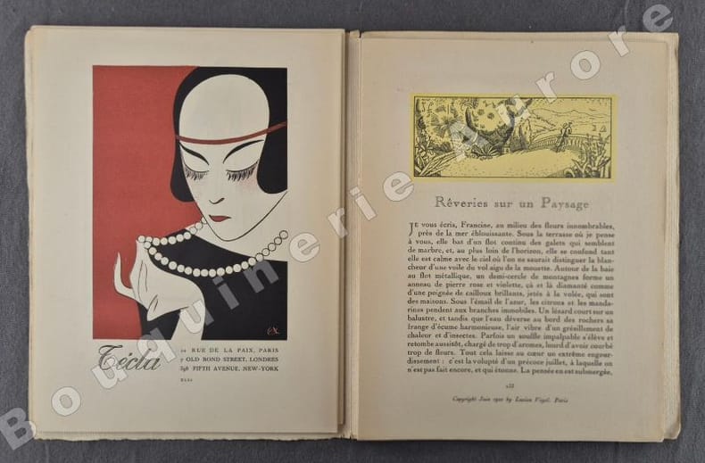 1920 P., Edition Lucien Vogel, 1920, 1 vol. in-8 (245 x 198) en feuilles sous couverture imprimée en noir, de (5) ff. (sommaire & publicités paginés XXV à XXXIV) - 32 pp. (paginées de 101 à 132) - 8 planches H.T. (Pl. 24 à 31) - 1 cahier titré "Robes pour l'été 1920 - Le panorama est de Raoul Dufy. Les soieries sont de Bianchini Férier et Cie composées par Raoul Dufy" contenant 1 panorama dépliant formé de 4 planches couleurs numéroté "Pl. 21 à 24".Très bel exemplaire.
