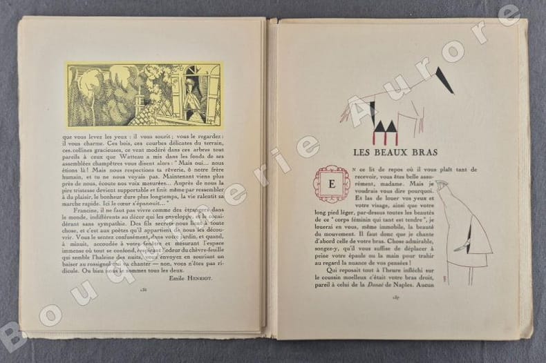 8 planches hors texte (pl. 32 à 39), coloriées au pochoir, de Bénito, L'Hom, Siméon, Pierre Brissaud (2), André-Edouard Marty, Georges Lepape et Bernard Boutet de Monvel, pour des créations de Paul Poiret, Worth, Doeuillet, Beer, Jeanne Lanvin + 4 planches de croquis par Süe et Mare sous cahier titré "Aménagement d'une Loge d'Actrice par Süe & Mare exécuté par La Compagnie des Arts Français". Les pages publicitaires contiennent : Coiffures par Emile Ltd - Produits du Dr Dys Darcy - Fourrures Weil (illustration pleine page non signée mais dans l'esprit de Charles Martin) - Chez Mercier (illustration pleine page monogrammée) - Eugène de Londres (illustration à pleine page non signée) - Mappin & Webb (illustration à pleine page signée Edouard Halouze) - Mercie Mc Hardy (illustration à pleine page monogrammée M. R. (Romme)) - Técla 'illustration à pleine page très visuelle monogrammée EX).Articles illustrés en couleurs: - Rêveries sur un paysage (Texte d'Emile Henriot - dessins de Laboureur) - Les beaux bas (Eugène Marsan - Bénito) - Du sable, de la volupté, de la mer (Gérard Bauër - Robert Bonfils) - Bijouterie Fétichiste (Jean Bernier - Roger Roy) - Modes Tchéco-Slovaques (Nicolas Boonnechose - L'Hom) - Transparences (Marcel Astruc - Mario Simon) - Spectacles (Jacques Porel - Marty) - Fenêtres et crevés (Georges-Armand Masson - Jaques). "La Gazette du Bon Ton "Art, Modes & Frivolités" est une revue de mode fondée à Paris en 1912 par Lucien Vogel. Elle a paru jusqu'en 1925, avec une interruption de 1916 à 1920, soit 69 livraisons. Elle comprend 573 planches coloriées au pochoir et 148 croquis représentant des modèles de couturiers. Chaque fascicule constitue un album de luxe, imprimé sur beau papier en Cochin, caractère totalement nouveau à l'époque. De nombreux artistes y ont collaboré : Guy Arnoux, Léon Bakst, George Barbier, Benito, Pierre Brissaud, Bernard Boutet de Monvel, Umberto Brunelleschi, Chas Laborde, Jean-Gabriel Domergue, Raoul Dufy, Édouard Halouze, Alexandre Iacovleff, Jean Emile Laboureur, Georges Lepape, Charles Loupot, Charles Martin, André-Edouard Marty Ces artistes, inconnus pour la plupart lorsque Lucien Vogel fait appel à eux, imposeront une nouvelle image de la femme. Ils garderont de leur collaboration à cette revue un socle esthétique commun et exposeront leurs uvres sous le nom de Collaborateurs de la Gazette du bon ton. Les planches représentent les robes des créateurs de l'époque : Lanvin, Doeuillet, Paquin, Poiret, Worth, Vionnet, Doucet. Certaines planches ne figurent aucun modèle réel, mais seulement l'idée que l'illustrateur se fait de la mode du jour. [...] La naissance de la Gazette du bon ton est un événement dans l'histoire de l'édition de mode. C'est la première revue qui allie souci esthétique, exigence de beauté et d'unité plastique." (Sources Wikipédia). Réf. biblio. : Colas 1202.