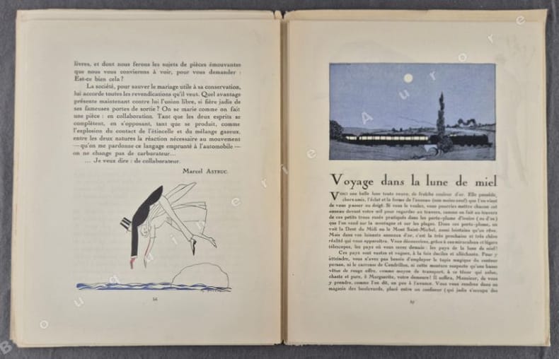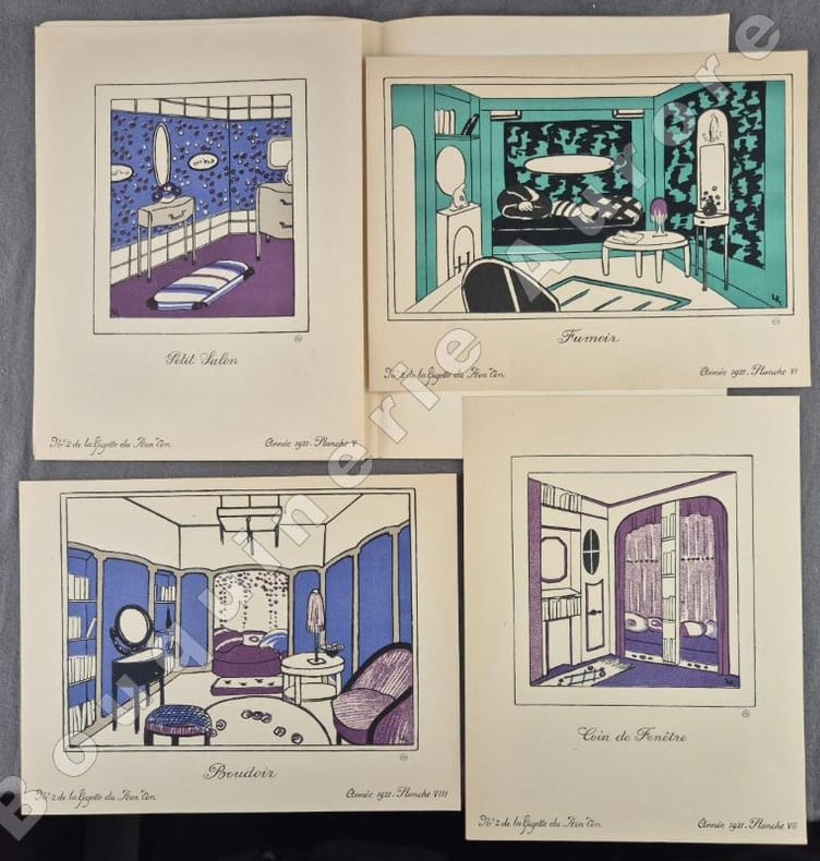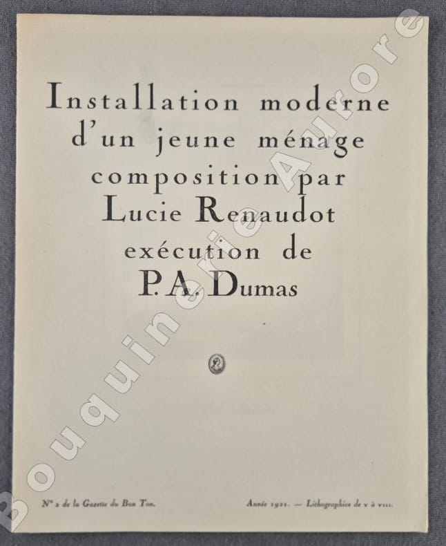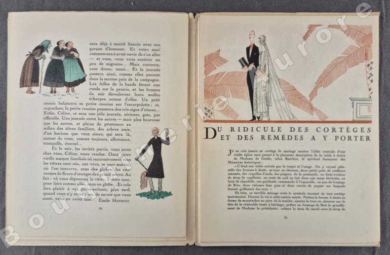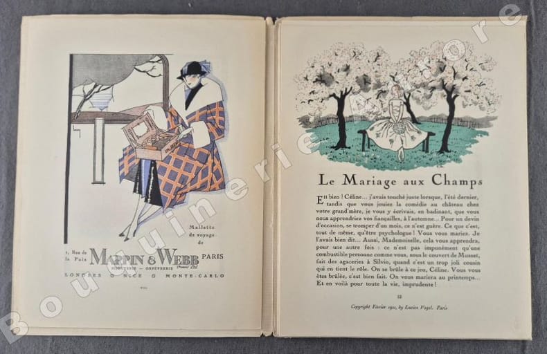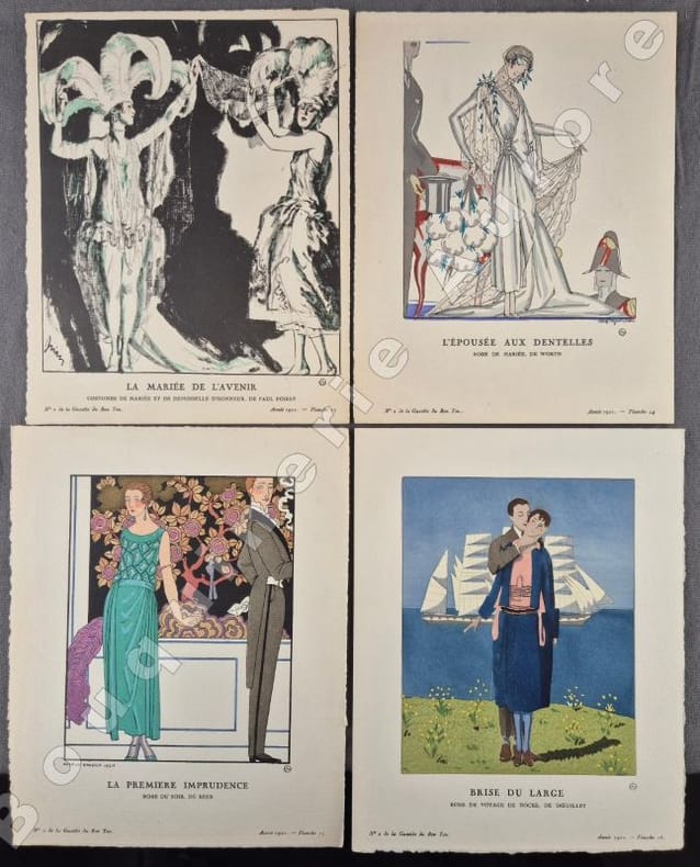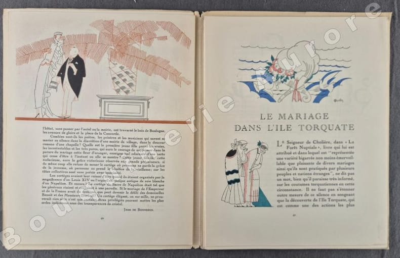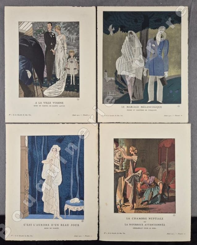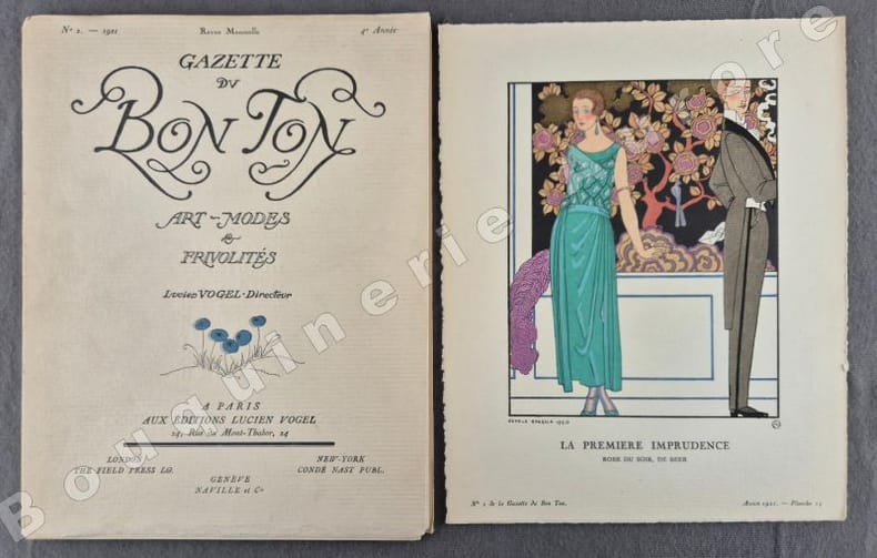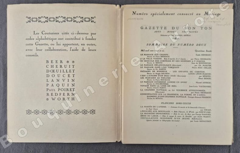 8 planches hors texte (pl. 9 à 16), coloriées au pochoir, de Pierre Brissaud - Charles Martin - Eduardo Benito - Adrien Drian - Alex Rzewuski - George Barbier - André-Edouard Marty pour des créations de Paul Poiret, Worth, Doeuillet, Beer + 4 planches de croquis par Lucie Renaudot sous cahier titré "Installation moderne d'un jeune ménage. Compositions par Lucie Renaudot exécution de P.A. Dumas". Articles illustrés en couleurs: - Le Mariage aux Champs (texte de Emile Henriot, dessins de Pierre Brissaud) - Du Ridicule des cortèges et des remèdes à y porter (Jean de Bonnefon, Bénito) - Le mariage dans l'Ile Torquate (Pierre Mac Orlan, Charles martin) - Présages de Bonheur (Louis Léon-Martin, Maggie Salzedo) - Les mariages au théâtre (Henri Bidou, Pierre Mourgue) - Le mariage considéré comme un sport (Marcel Astruc, Zyg-Brunner) - Voyage dans la lune de miel (Jean-Louis Vaudoyer, André Marty) - Considérations sur la grandeur, la forme, et l'ameublement d'une chambre nuptiale (Georges-Armand Masson, Bénito) - Explication des planches. Numéro bien complet."La Gazette du Bon Ton "Art, Goût, Beauté" est une revue de mode fondée à Paris en 1912 par Lucien Vogel. Elle a paru jusqu'en 1925, avec une interruption de 1916 à 1920, soit 69 livraisons. Elle comprend 573 planches coloriées au pochoir et 148 croquis représentant des modèles de couturiers. Chaque fascicule constitue un album de luxe, imprimé sur beau papier en Cochin, caractère totalement nouveau à l'époque. De nombreux artistes y ont collaboré : Guy Arnoux, Léon Bakst, George Barbier, Benito, Pierre Brissaud, Bernard Boutet de Monvel, Umberto Brunelleschi, Chas Laborde, Jean-Gabriel Domergue, Raoul Dufy, Édouard Halouze, Alexandre Iacovleff, Jean Emile Laboureur, Georges Lepape, Charles Loupot, Charles Martin, André-Edouard Marty Ces artistes, inconnus pour la plupart lorsque Lucien Vogel fait appel à eux, imposeront une nouvelle image de la femme. Ils garderont de leur collaboration à cette revue un socle esthétique commun et exposeront leurs uvres sous le nom de Collaborateurs de la Gazette du bon ton. Les planches représentent les robes des créateurs de l'époque : Lanvin, Doeuillet, Paquin, Poiret, Worth, Vionnet, Doucet. Certaines planches ne figurent aucun modèle réel, mais seulement l'idée que l'illustrateur se fait de la mode du jour. [...] La naissance de la Gazette du bon ton est un événement dans l'histoire de l'édition de mode. C'est la première revue qui allie souci esthétique, exigence de beauté et d'unité plastique." (Sources Wikipédia). Réf. biblio. : Colas 1202.