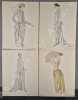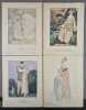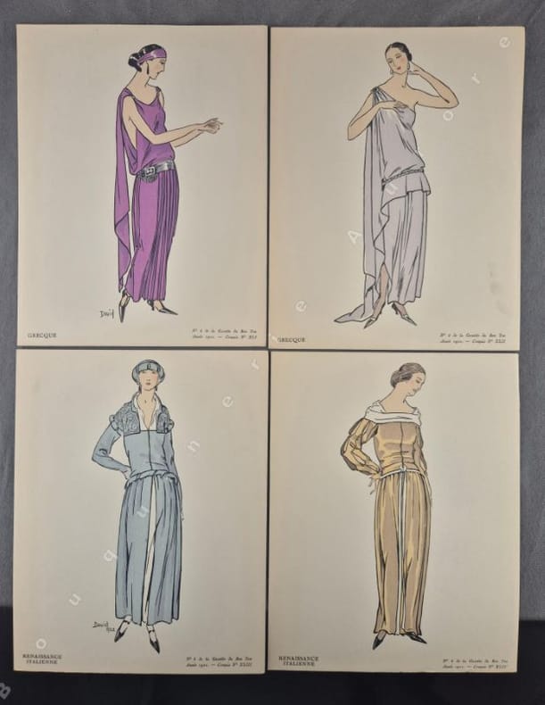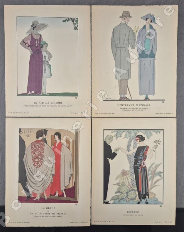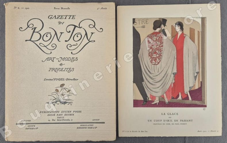 8 planches hors texte (pl. 25 à 32), coloriées au pochoir, de Préjelan, Pierre Brissaud, André Marty, George Barbier, Benito, Siméon, Thayaht et Georges Lepape pour des créations de Jeanne Lanvin, Worth, Beer, Paul Poiret, Martial et Armand, Lus et Befve, Madeleine Vionnet, Larsen, Kriegck - 8 Croquis hors texte, coloriés au pochoir "Costumes tailleur de Fantaisie" (Croquis N°XXV à XXXII). Il est annoncé dans la table : "Mobiliers (encartage), Maison Carlhan", absent ici, c'est normal, cet encartage a finalement été fourni dans le N°5 de la même année.Articles illustrés en couleurs: Les masculines, de Roger Boutet de Monvel, dessins de Bernard Boutet de Monvel - Chapeaux de Camille Roger, de Vaudreuil, dessins de Georges Lepape - Du bijou unique ou voyage du solitaire, de Gérard Bauër, dessins de Marcel Vertès - Armorial des écrivains français, quelques poètes, de Jean de Bonnefon, dessins de Gaston Joubert de Bussy - Cheveux, de Jeanne Ramon-Fernandez, dessins d'André Marty - Portrait de Casanova, de George Barbier, dessins de Charles Martin - Costumes tailleur de fantaisie, croquis du Bon Ton - La mode et le Bon Ton, de J.R.-F. Numéro bien complet."La Gazette du Bon Ton "Art, Goût, Beauté" est une revue de mode fondée à Paris en 1912 par Lucien Vogel. Elle a paru jusqu'en 1925, avec une interruption de 1916 à 1920, soit 69 livraisons. Elle comprend 573 planches coloriées au pochoir et 148 croquis représentant des modèles de couturiers. Chaque fascicule constitue un album de luxe, imprimé sur beau papier en Cochin, caractère totalement nouveau à l'époque. De nombreux artistes y ont collaboré : Guy Arnoux, Léon Bakst, George Barbier, Benito, Pierre Brissaud, Boutet de Monvel, Umberto Brunelleschi, Chas Laborde, Jean-Gabriel Domergue, Raoul Dufy, Édouard Halouze, Alexandre Iacovleff, Jean Emile Laboureur, Georges Lepape, Charles Loupot, Charles Martin, André-Edouard Marty Ces artistes, inconnus pour la plupart lorsque Lucien Vogel fait appel à eux, imposeront une nouvelle image de la femme. Ils garderont de leur collaboration à cette revue un socle esthétique commun et exposeront leurs uvres sous le nom de Collaborateurs de la Gazette du bon ton. Les planches représentent les robes des créateurs de l'époque : Lanvin, Doeuillet, Paquin, Poiret, Worth, Vionnet, Doucet. Certaines planches ne figurent aucun modèle réel, mais seulement l'idée que l'illustrateur se fait de la mode du jour. [] La naissance de la Gazette du bon ton est un événement dans l'histoire de l'édition de mode. C'est la première revue qui allie souci esthétique, exigence de beauté et d'unité plastique." (Sources Wikipédia).Réf. biblio. : Colas 1202.