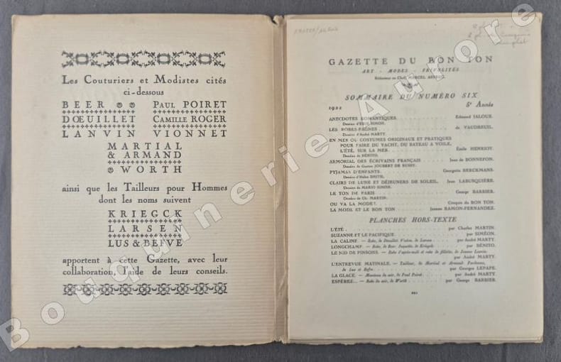 Numéro bien complet de ses 8 planches hors texte (pl. 33 à 40), coloriées au pochoir, de Robert Bonfils, Mario Simon, Bénito, Pierre Brissaud, André Marty, George Barbier, Thayaht et Georges Lepape pour des créations de Jeanne Lanvin, Worth, Beer, Kriegck, Larsen, Paul Poiret, Martial et Armand, Lus et Befve, Madeleine Vionnet - 8 Croquis hors texte, coloriés au pochoir (Croquis N°XXXIII à XL). Articles illustrés en couleurs: Don Juan, de Jean-Louis Vaudoyer, dessins d'André Marty - Ecrits sur le sable, de Marcel Astruc, dessins de Bénito - Bonnets et chapeaux, de G.-A. Masson, dessins de Georges Lepape - De mil huit cent soixante-quinze à mil neuf cent, de Jeanne Ramon-Fernandez, dessins de Woodruff - Robes de bain, de Nicolas Bonnechose, dessins de Pierre Brissaud - Manteaux pour tous les sports, de Vaudreuil, dessins de Pierre Mourgue - Le Flirting à travers le monde, de George Cecil, dessins de Charles Martin - Robes à danser inspirées des costumes de femmes de couleur de l'Afrique Centrale, croquis du Bon Ton - La mode et le Bon Ton, de J.R.-F. "La Gazette du Bon Ton "Art, Goût, Beauté" est une revue de mode fondée à Paris en 1912 par Lucien Vogel. Elle a paru jusqu'en 1925, avec une interruption de 1916 à 1920, soit 69 livraisons. Elle comprend 573 planches coloriées au pochoir et 148 croquis représentant des modèles de couturiers. Chaque fascicule constitue un album de luxe, imprimé sur beau papier en Cochin, caractère totalement nouveau à l'époque. De nombreux artistes y ont collaboré : Guy Arnoux, Léon Bakst, George Barbier, Benito, Pierre Brissaud, Boutet de Monvel, Umberto Brunelleschi, Chas Laborde, Jean-Gabriel Domergue, Raoul Dufy, Édouard Halouze, Alexandre Iacovleff, Jean Emile Laboureur, Georges Lepape, Charles Loupot, Charles Martin, André-Edouard Marty Ces artistes, inconnus pour la plupart lorsque Lucien Vogel fait appel à eux, imposeront une nouvelle image de la femme. Ils garderont de leur collaboration à cette revue un socle esthétique commun et exposeront leurs uvres sous le nom de Collaborateurs de la Gazette du bon ton. Les planches représentent les robes des créateurs de l'époque : Lanvin, Doeuillet, Paquin, Poiret, Worth, Vionnet, Doucet. Certaines planches ne figurent aucun modèle réel, mais seulement l'idée que l'illustrateur se fait de la mode du jour. [] La naissance de la Gazette du bon ton est un événement dans l'histoire de l'édition de mode. C'est la première revue qui allie souci esthétique, exigence de beauté et d'unité plastique." (Sources Wikipédia).