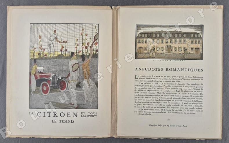1922 P., Aux Editions Lucien Vogel, 1922, 1 vol. in-8 (250 x 198) en feuilles sous couverture imprimée en noir, de (2) ff. (sommaire, publicités, dont très belle en couleur pour Citroën) - 32 pp. (texte, numéroté de 165 à 196) - 8 planches coloriées au pochoir et 8 Croquis H.T. coloriés au pochoir. Dos légèrement insolé, petit accroc en coiffe supérieure, très bon état par ailleurs.