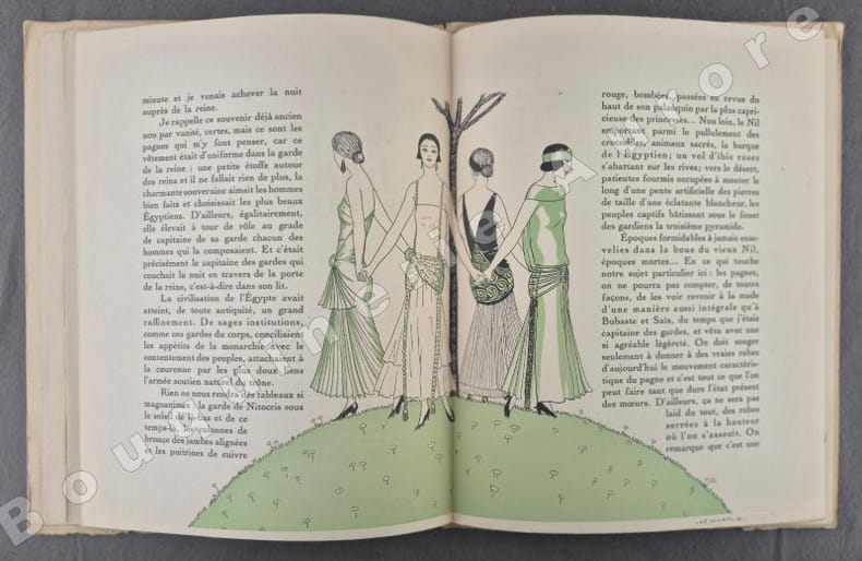 8 planches hors texte (pl. 1 à 8), coloriées au pochoir, de Pierre Mourgue (2), Erikson, Llano Florez, Pierre Brissaud, André Marty, George Barbier et Zenker pour des créations de Jeanne Lanvin, Worth, Beer, Paul Poiret, Martial et Armand - 8 Croquis hors texte, coloriés au pochoir, sous le titre "Album des dames, leurs modes et frivolités" (Croquis N°I à VIII). Articles illustrés en couleurs: Ermenonville ou le promeneur solitaire, de Robert Burnand, dessins d'André Marty - La parade de l'accouchée, de Francis de Miomandre, dessins de Bénito - Gestes, de De Vaudreuil, dessins de Pierre Mourgue - Renaissance, d'Emile Henriot, dessins de Pierre Brissaud - Adam ou la bonne volonté, de Marcel Astruc, dessins de Jacques Demachy - La Pluie, de G.-A. Masson, dessins de Georges Lepape - Autres temps, autres moeurs, de George Cecil, dessins de Charles Martin - Album des dames, leur mode, leur frivolité, croquis du Bon Ton - La mode et le Bon Ton, de Jeanne Ramon-Fernandez..Numéro bien complet."La Gazette du Bon Ton "Art, Goût, Beauté" est une revue de mode fondée à Paris en 1912 par Lucien Vogel. Elle a paru jusqu'en 1925, avec une interruption de 1916 à 1920, soit 69 livraisons. Elle comprend 573 planches coloriées au pochoir et 148 croquis représentant des modèles de couturiers. Chaque fascicule constitue un album de luxe, imprimé sur beau papier en Cochin, caractère totalement nouveau à l'époque. De nombreux artistes y ont collaboré : Guy Arnoux, Léon Bakst, George Barbier, Benito, Pierre Brissaud, Boutet de Monvel, Umberto Brunelleschi, Chas Laborde, Jean-Gabriel Domergue, Raoul Dufy, Édouard Halouze, Alexandre Iacovleff, Jean Emile Laboureur, Georges Lepape, Charles Loupot, Charles Martin, André-Edouard Marty Ces artistes, inconnus pour la plupart lorsque Lucien Vogel fait appel à eux, imposeront une nouvelle image de la femme. Ils garderont de leur collaboration à cette revue un socle esthétique commun et exposeront leurs uvres sous le nom de Collaborateurs de la Gazette du bon ton. Les planches représentent les robes des créateurs de l'époque : Lanvin, Doeuillet, Paquin, Poiret, Worth, Vionnet, Doucet. Certaines planches ne figurent aucun modèle réel, mais seulement l'idée que l'illustrateur se fait de la mode du jour. [] La naissance de la Gazette du bon ton est un événement dans l'histoire de l'édition de mode. C'est la première revue qui allie souci esthétique, exigence de beauté et d'unité plastique." (Sources Wikipédia).