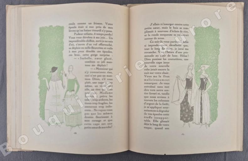 1922 P., Aux Editions Lucien Vogel, 1922, 1 vol. in-8 (250 x 198) en feuilles sous couverture imprimée en noir, de (2) ff. (sommaire, publicités, numérotées XXXIII à XXXVI) - 28 pp. (texte, numéroté de 257 à 284) - 8 planches coloriées au pochoir et 8 Croquis H.T. coloriés au pochoir. Dos légèrement insolé, petit accroc en coiffe supérieure, très bon état par ailleurs.