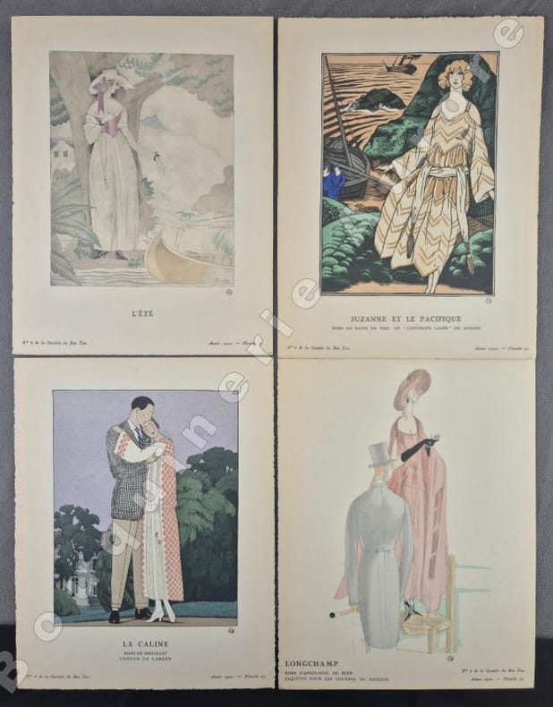 8 planches hors texte (pl. 41 à 48), coloriées au pochoir, de Charles Martin, Siméon, Bénito, André Marty (3), George Barbier et Georges Lepape pour des créations de Jeanne Lanvin, Worth, Beer, Kriegck, Larsen, Paul Poiret, Doeuillet, Martial et Armand, Lus et Befve - 8 Croquis hors texte, coloriés au pochoir (Croquis N°XLI à XLVIII). Articles illustrés en couleurs: Anecdotes romantiques, d'Edmond Jaloux, dessins d'Erik Simon - Les robes-pagnes, de Vaudreuil, dessins d'André Marty - En mer, d'Emile Henriot, dessins de Bénito - Armorial des écrivains français, de Jean de Bonnefon, dessins de Gaston Joubert de Bussy - Pyjamas d'enfants, de Georgette Berckmans, dessins d'Helen Smith - Clairs de lune et déjeuners de soleil, de Jean Labusquière, dessins de Mario Simon - Le ton de Paris, de George Barbier, dessins de Charles Martin - Ou va la mode ?, croquis du Bon Ton - La mode et le Bon Ton, de J.R.-F."La Gazette du Bon Ton "Art, Goût, Beauté" est une revue de mode fondée à Paris en 1912 par Lucien Vogel. Elle a paru jusqu'en 1925, avec une interruption de 1916 à 1920, soit 69 livraisons. Elle comprend 573 planches coloriées au pochoir et 148 croquis représentant des modèles de couturiers. Chaque fascicule constitue un album de luxe, imprimé sur beau papier en Cochin, caractère totalement nouveau à l'époque. De nombreux artistes y ont collaboré : Guy Arnoux, Léon Bakst, George Barbier, Benito, Pierre Brissaud, Boutet de Monvel, Umberto Brunelleschi, Chas Laborde, Jean-Gabriel Domergue, Raoul Dufy, Édouard Halouze, Alexandre Iacovleff, Jean Emile Laboureur, Georges Lepape, Charles Loupot, Charles Martin, André-Edouard Marty Ces artistes, inconnus pour la plupart lorsque Lucien Vogel fait appel à eux, imposeront une nouvelle image de la femme. Ils garderont de leur collaboration à cette revue un socle esthétique commun et exposeront leurs uvres sous le nom de Collaborateurs de la Gazette du bon ton. Les planches représentent les robes des créateurs de l'époque : Lanvin, Doeuillet, Paquin, Poiret, Worth, Vionnet, Doucet. Certaines planches ne figurent aucun modèle réel, mais seulement l'idée que l'illustrateur se fait de la mode du jour. [] La naissance de la Gazette du bon ton est un événement dans l'histoire de l'édition de mode. C'est la première revue qui allie souci esthétique, exigence de beauté et d'unité plastique." (Sources Wikipédia). Réf. biblio. : Colas 1202.