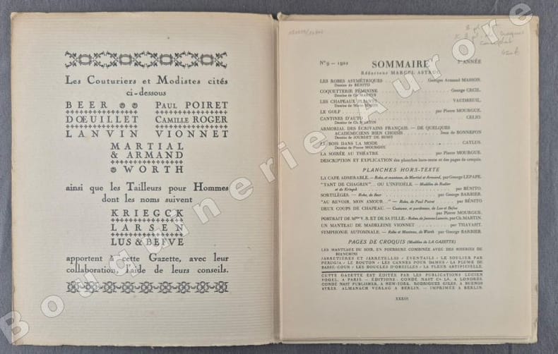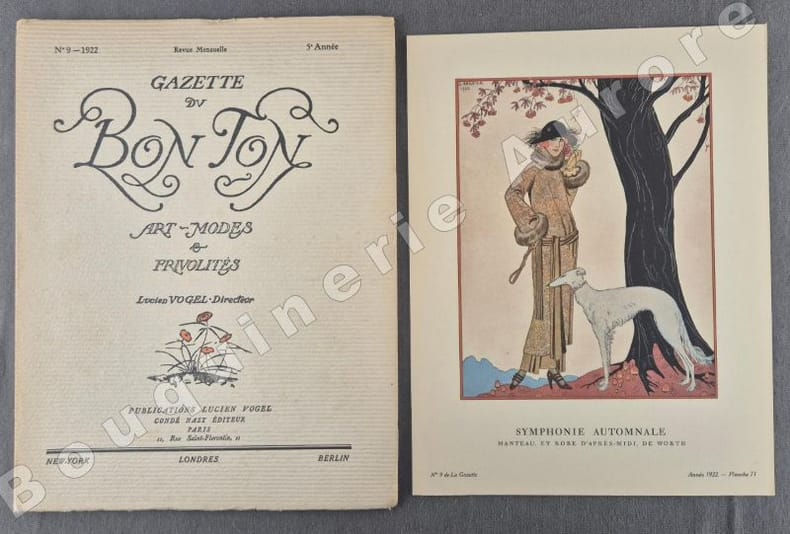 8 planches hors texte (pl. 1 à 8), coloriées au pochoir, de Pierre Mourgue (2), Erikson, Llano Florez, Pierre Brissaud, André Marty, George Barbier et Zenker pour des créations de Jeanne Lanvin, Worth, Beer, Paul Poiret, Martial et Armand - 8 Croquis hors texte, coloriés au pochoir, sous le titre "Album des dames, leurs modes et frivolités" (Croquis N°I à VIII). Articles illustrés en couleurs: Ermenonville ou le promeneur solitaire, de Robert Burnand, dessins d'André Marty - La parade de l'accouchée, de Francis de Miomandre, dessins de Bénito - Gestes, de De Vaudreuil, dessins de Pierre Mourgue - Renaissance, d'Emile Henriot, dessins de Pierre Brissaud - Adam ou la bonne volonté, de Marcel Astruc, dessins de Jacques Demachy - La Pluie, de G.-A. Masson, dessins de Georges Lepape - Autres temps, autres moeurs, de George Cecil, dessins de Charles Martin - Album des dames, leur mode, leur frivolité, croquis du Bon Ton - La mode et le Bon Ton, de Jeanne Ramon-Fernandez..Numéro bien complet."La Gazette du Bon Ton "Art, Goût, Beauté" est une revue de mode fondée à Paris en 1912 par Lucien Vogel. Elle a paru jusqu'en 1925, avec une interruption de 1916 à 1920, soit 69 livraisons. Elle comprend 573 planches coloriées au pochoir et 148 croquis représentant des modèles de couturiers. Chaque fascicule constitue un album de luxe, imprimé sur beau papier en Cochin, caractère totalement nouveau à l'époque. De nombreux artistes y ont collaboré : Guy Arnoux, Léon Bakst, George Barbier, Benito, Pierre Brissaud, Boutet de Monvel, Umberto Brunelleschi, Chas Laborde, Jean-Gabriel Domergue, Raoul Dufy, Édouard Halouze, Alexandre Iacovleff, Jean Emile Laboureur, Georges Lepape, Charles Loupot, Charles Martin, André-Edouard Marty Ces artistes, inconnus pour la plupart lorsque Lucien Vogel fait appel à eux, imposeront une nouvelle image de la femme. Ils garderont de leur collaboration à cette revue un socle esthétique commun et exposeront leurs uvres sous le nom de Collaborateurs de la Gazette du bon ton. Les planches représentent les robes des créateurs de l'époque : Lanvin, Doeuillet, Paquin, Poiret, Worth, Vionnet, Doucet. Certaines planches ne figurent aucun modèle réel, mais seulement l'idée que l'illustrateur se fait de la mode du jour. [] La naissance de la Gazette du bon ton est un événement dans l'histoire de l'édition de mode. C'est la première revue qui allie souci esthétique, exigence de beauté et d'unité plastique." (Sources Wikipédia).