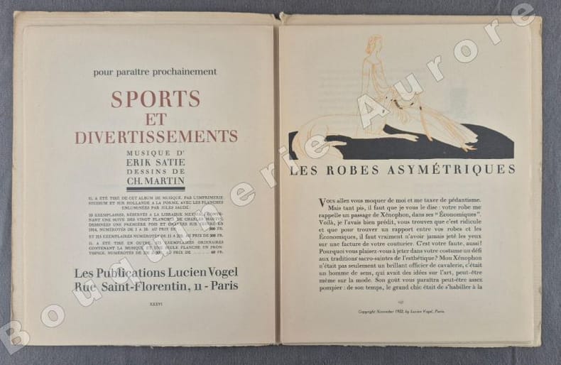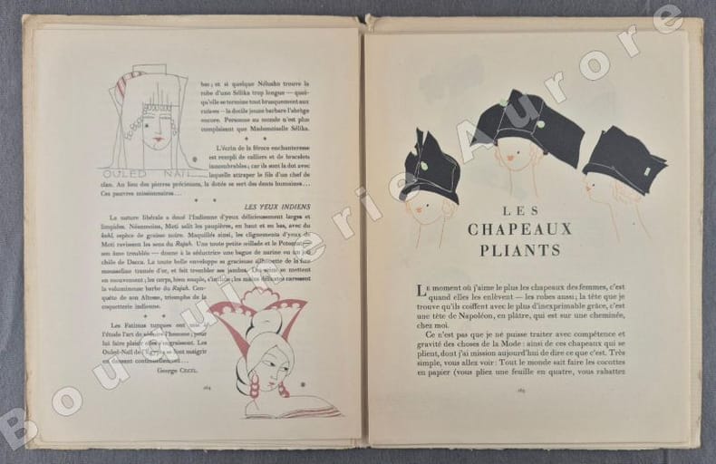 1922 P., Aux Editions Lucien Vogel, 1922, 1 vol. in-8 (250 x 198) en feuilles sous couverture imprimée en noir, de (2) ff. (sommaire, publicités, numérotées XXXIII à XXXVI) - 28 pp. (texte, numéroté de 257 à 284) - 8 planches coloriées au pochoir et 8 Croquis H.T. coloriés au pochoir. Dos légèrement insolé, petit accroc en coiffe supérieure, très bon état par ailleurs.