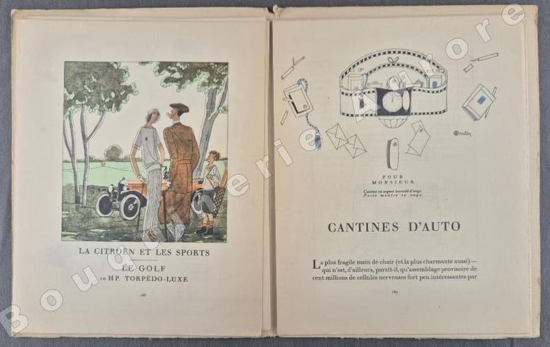 1922 P., Aux Editions Lucien Vogel, 1922, 1 vol. in-8 (250 x 198) en feuilles sous couverture imprimée en noir, de (2) ff. (sommaire, publicités, dont très belle en couleur pour Citroën) - 32 pp. (texte, numéroté de 165 à 196) - 8 planches coloriées au pochoir et 8 Croquis H.T. coloriés au pochoir. Dos légèrement insolé, petit accroc en coiffe supérieure, très bon état par ailleurs.