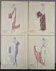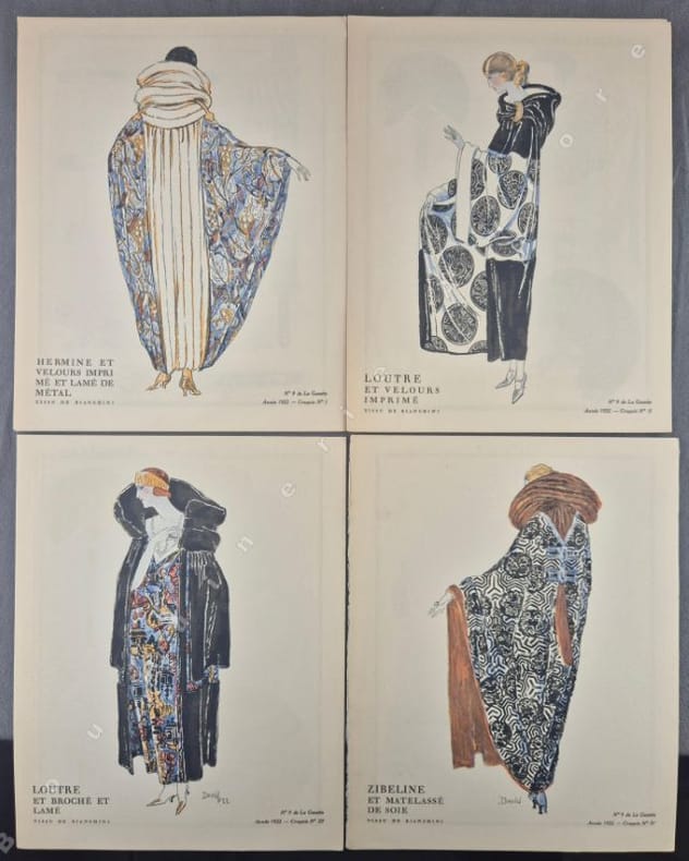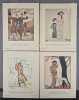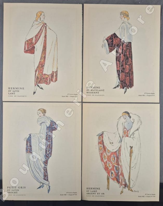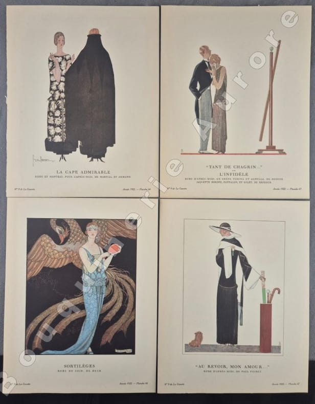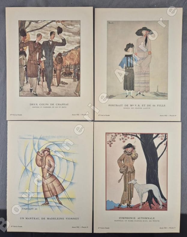 8 planches hors texte (pl. 25 à 32), coloriées au pochoir, de Préjelan, Pierre Brissaud, André Marty, George Barbier, Benito, Siméon, Thayaht et Georges Lepape pour des créations de Jeanne Lanvin, Worth, Beer, Paul Poiret, Martial et Armand, Lus et Befve, Madeleine Vionnet, Larsen, Kriegck - 8 Croquis hors texte, coloriés au pochoir "Costumes tailleur de Fantaisie" (Croquis N°XXV à XXXII). Il est annoncé dans la table : "Mobiliers (encartage), Maison Carlhan", absent ici, c'est normal, cet encartage a finalement été fourni dans le N°5 de la même année.Articles illustrés en couleurs: Les masculines, de Roger Boutet de Monvel, dessins de Bernard Boutet de Monvel - Chapeaux de Camille Roger, de Vaudreuil, dessins de Georges Lepape - Du bijou unique ou voyage du solitaire, de Gérard Bauër, dessins de Marcel Vertès - Armorial des écrivains français, quelques poètes, de Jean de Bonnefon, dessins de Gaston Joubert de Bussy - Cheveux, de Jeanne Ramon-Fernandez, dessins d'André Marty - Portrait de Casanova, de George Barbier, dessins de Charles Martin - Costumes tailleur de fantaisie, croquis du Bon Ton - La mode et le Bon Ton, de J.R.-F. Numéro bien complet."La Gazette du Bon Ton "Art, Goût, Beauté" est une revue de mode fondée à Paris en 1912 par Lucien Vogel. Elle a paru jusqu'en 1925, avec une interruption de 1916 à 1920, soit 69 livraisons. Elle comprend 573 planches coloriées au pochoir et 148 croquis représentant des modèles de couturiers. Chaque fascicule constitue un album de luxe, imprimé sur beau papier en Cochin, caractère totalement nouveau à l'époque. De nombreux artistes y ont collaboré : Guy Arnoux, Léon Bakst, George Barbier, Benito, Pierre Brissaud, Boutet de Monvel, Umberto Brunelleschi, Chas Laborde, Jean-Gabriel Domergue, Raoul Dufy, Édouard Halouze, Alexandre Iacovleff, Jean Emile Laboureur, Georges Lepape, Charles Loupot, Charles Martin, André-Edouard Marty Ces artistes, inconnus pour la plupart lorsque Lucien Vogel fait appel à eux, imposeront une nouvelle image de la femme. Ils garderont de leur collaboration à cette revue un socle esthétique commun et exposeront leurs uvres sous le nom de Collaborateurs de la Gazette du bon ton. Les planches représentent les robes des créateurs de l'époque : Lanvin, Doeuillet, Paquin, Poiret, Worth, Vionnet, Doucet. Certaines planches ne figurent aucun modèle réel, mais seulement l'idée que l'illustrateur se fait de la mode du jour. [] La naissance de la Gazette du bon ton est un événement dans l'histoire de l'édition de mode. C'est la première revue qui allie souci esthétique, exigence de beauté et d'unité plastique." (Sources Wikipédia).Réf. biblio. : Colas 1202.
