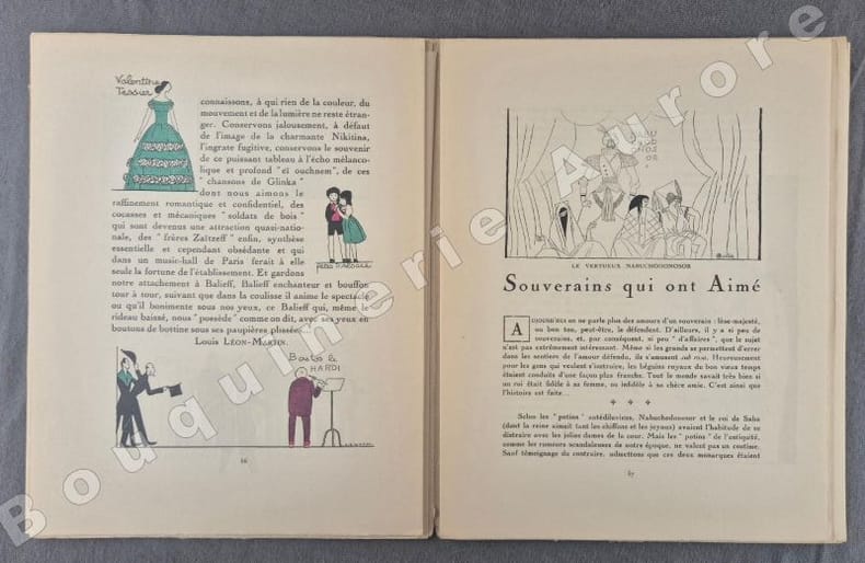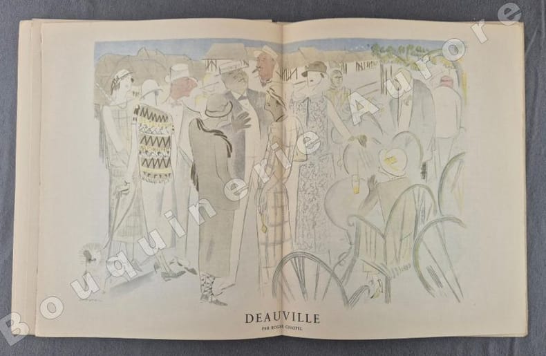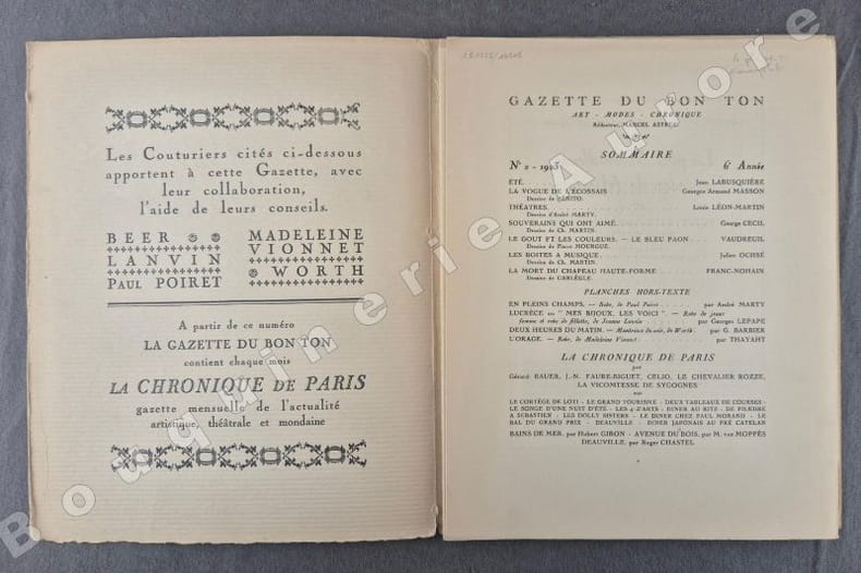 4 planches hors texte (pl. 7 à 10), coloriées au pochoir, de André E. Marty, Georges Lepape, George Barbier et Thayaht pour des créations de Jeanne Lanvin, Worth, Paul Poiret, Madeleine Vionnet. Articles illustrés en couleurs: Eté par Jean Labusquière - La Vogue de l'Ecossais (texte de Georges Armand Masson, dessins de Bénito) - Théâtres (Louis Léon-Martin - André Marty) - Souverains qui ont aimé (Cécile - Charles Martin) - Le goût et les couleurs, le bleu paon (Vaudreuil - Pierre Mourgue) - Les boîtes à musique (Jean Ocshé - Martin) - La mort du chapeau haut-de-forme (Franc-Nohain, Carlègle) - La Chronique de Paris (avec illustrations en couleurs de Giron (Bains de Mer) - Roger Chastel (Deauville, illustration à double page ; et Avenue du bois (illustration en noir)). Numéro bien complet."La Gazette du Bon Ton "Art, Goût, Beauté" est une revue de mode fondée à Paris en 1912 par Lucien Vogel. Elle a paru jusqu'en 1925, avec une interruption de 1916 à 1920, soit 69 livraisons. Elle comprend 573 planches coloriées au pochoir et 148 croquis représentant des modèles de couturiers. Chaque fascicule constitue un album de luxe, imprimé sur beau papier en Cochin, caractère totalement nouveau à l'époque. De nombreux artistes y ont collaboré : Guy Arnoux, Léon Bakst, George Barbier, Benito, Pierre Brissaud, Boutet de Monvel, Umberto Brunelleschi, Chas Laborde, Jean-Gabriel Domergue, Raoul Dufy, Édouard Halouze, Alexandre Iacovleff, Jean Emile Laboureur, Georges Lepape, Charles Loupot, Charles Martin, André-Edouard Marty Ces artistes, inconnus pour la plupart lorsque Lucien Vogel fait appel à eux, imposeront une nouvelle image de la femme. Ils garderont de leur collaboration à cette revue un socle esthétique commun et exposeront leurs uvres sous le nom de Collaborateurs de la Gazette du bon ton. Les planches représentent les robes des créateurs de l'époque : Lanvin, Doeuillet, Paquin, Poiret, Worth, Vionnet, Doucet. Certaines planches ne figurent aucun modèle réel, mais seulement l'idée que l'illustrateur se fait de la mode du jour. [] La naissance de la Gazette du bon ton est un événement dans l'histoire de l'édition de mode. C'est la première revue qui allie souci esthétique, exigence de beauté et d'unité plastique." (Sources Wikipédia). Réf. biblio. : Colas 1202.
