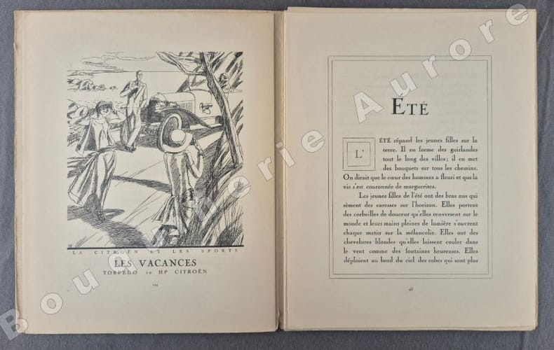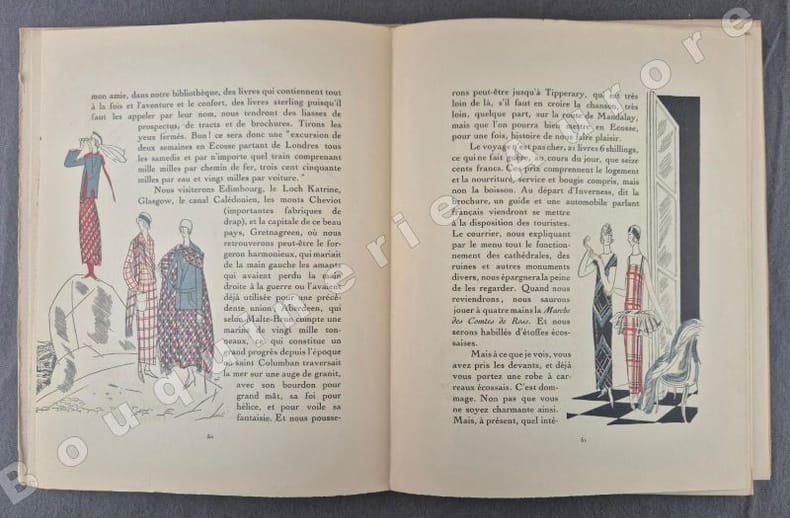1923 P., Rue de Rivoli, n°222, 1923, 1 vol. in-8 (250 x 198) en feuilles sous couverture imprimée en noir, de IV pp. (numérotées de IX à XII) (sommaire, publicités, explication des planches) - 44 pp. (numérotées de 93 à 136)(texte) - 4 planches coloriées au pochoir.Dos légèrement insolé, très bel exemplaire complet de ses pochoirs par ailleurs.