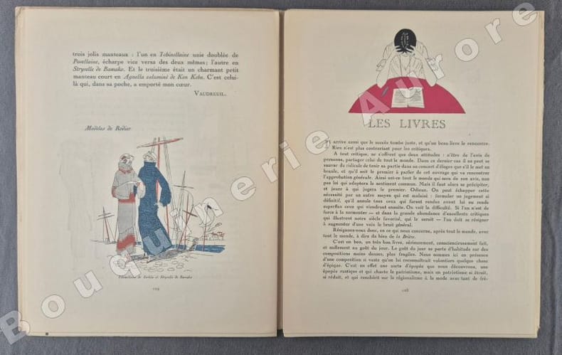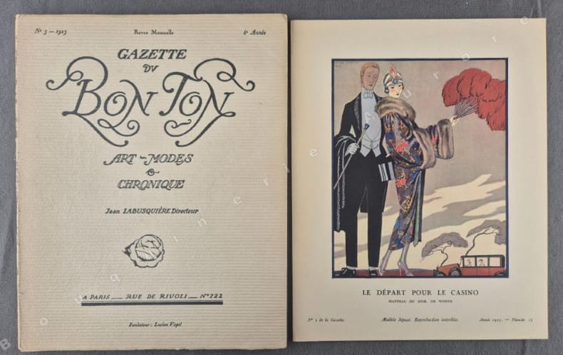 4 planches hors texte (pl. 7 à 10), coloriées au pochoir, de André E. Marty, Georges Lepape, George Barbier et Thayaht pour des créations de Jeanne Lanvin, Worth, Paul Poiret, Madeleine Vionnet. Articles illustrés en couleurs: Eté par Jean Labusquière - La Vogue de l'Ecossais (texte de Georges Armand Masson, dessins de Bénito) - Théâtres (Louis Léon-Martin - André Marty) - Souverains qui ont aimé (Cécile - Charles Martin) - Le goût et les couleurs, le bleu paon (Vaudreuil - Pierre Mourgue) - Les boîtes à musique (Jean Ocshé - Martin) - La mort du chapeau haut-de-forme (Franc-Nohain, Carlègle) - La Chronique de Paris (avec illustrations en couleurs de Giron (Bains de Mer) - Roger Chastel (Deauville, illustration à double page ; et Avenue du bois (illustration en noir)). Numéro bien complet."La Gazette du Bon Ton "Art, Goût, Beauté" est une revue de mode fondée à Paris en 1912 par Lucien Vogel. Elle a paru jusqu'en 1925, avec une interruption de 1916 à 1920, soit 69 livraisons. Elle comprend 573 planches coloriées au pochoir et 148 croquis représentant des modèles de couturiers. Chaque fascicule constitue un album de luxe, imprimé sur beau papier en Cochin, caractère totalement nouveau à l'époque. De nombreux artistes y ont collaboré : Guy Arnoux, Léon Bakst, George Barbier, Benito, Pierre Brissaud, Boutet de Monvel, Umberto Brunelleschi, Chas Laborde, Jean-Gabriel Domergue, Raoul Dufy, Édouard Halouze, Alexandre Iacovleff, Jean Emile Laboureur, Georges Lepape, Charles Loupot, Charles Martin, André-Edouard Marty Ces artistes, inconnus pour la plupart lorsque Lucien Vogel fait appel à eux, imposeront une nouvelle image de la femme. Ils garderont de leur collaboration à cette revue un socle esthétique commun et exposeront leurs uvres sous le nom de Collaborateurs de la Gazette du bon ton. Les planches représentent les robes des créateurs de l'époque : Lanvin, Doeuillet, Paquin, Poiret, Worth, Vionnet, Doucet. Certaines planches ne figurent aucun modèle réel, mais seulement l'idée que l'illustrateur se fait de la mode du jour. [] La naissance de la Gazette du bon ton est un événement dans l'histoire de l'édition de mode. C'est la première revue qui allie souci esthétique, exigence de beauté et d'unité plastique." (Sources Wikipédia). Réf. biblio. : Colas 1202.