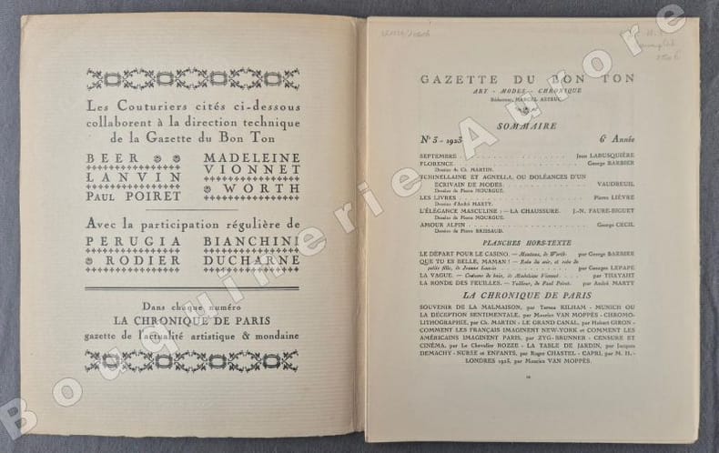 4 planches hors texte (pl. 11 à 14), coloriées au pochoir, de André E. Marty, Georges Lepape, George Barbier et Thayaht pour des créations de Jeanne Lanvin, Worth, Paul Poiret, Madeleine Vionnet. Articles illustrés en couleurs: Septembre par Jean Labusquière - Florence (texte de George Barbier, dessins de Charles Martin) - Tchinellaine et Agnella, ou Doléances d'un écrivain de modes (Vaudreuil, Pierre Mourgue) - Les Livres (Pierre Lièvre, André Marty) - L'élégance masculine : La Chaussure (Faure-Biguet, Mourgue) - Amour alpin (Cécil, Pierre Brissaud) - La Chronique de Paris (avec illustrations en couleurs à pleine page de : Charles Martin - Hubert Giron - Zyg Brunner (2 en noir) - Jacques Demachy - Roger Chastel - Maurice Van Moppès (en noir)). Numéro bien complet."La Gazette du Bon Ton "Art, Goût, Beauté" est une revue de mode fondée à Paris en 1912 par Lucien Vogel. Elle a paru jusqu'en 1925, avec une interruption de 1916 à 1920, soit 69 livraisons. Elle comprend 573 planches coloriées au pochoir et 148 croquis représentant des modèles de couturiers. Chaque fascicule constitue un album de luxe, imprimé sur beau papier en Cochin, caractère totalement nouveau à l'époque. De nombreux artistes y ont collaboré : Guy Arnoux, Léon Bakst, George Barbier, Benito, Pierre Brissaud, Boutet de Monvel, Umberto Brunelleschi, Chas Laborde, Jean-Gabriel Domergue, Raoul Dufy, Édouard Halouze, Alexandre Iacovleff, Jean Emile Laboureur, Georges Lepape, Charles Loupot, Charles Martin, André-Edouard Marty Ces artistes, inconnus pour la plupart lorsque Lucien Vogel fait appel à eux, imposeront une nouvelle image de la femme. Ils garderont de leur collaboration à cette revue un socle esthétique commun et exposeront leurs uvres sous le nom de Collaborateurs de la Gazette du bon ton. Les planches représentent les robes des créateurs de l'époque : Lanvin, Doeuillet, Paquin, Poiret, Worth, Vionnet, Doucet. Certaines planches ne figurent aucun modèle réel, mais seulement l'idée que l'illustrateur se fait de la mode du jour. [] La naissance de la Gazette du bon ton est un événement dans l'histoire de l'édition de mode. C'est la première revue qui allie souci esthétique, exigence de beauté et d'unité plastique." (Sources Wikipédia). Réf. biblio. : Colas 1202.