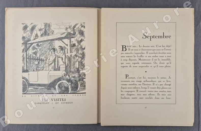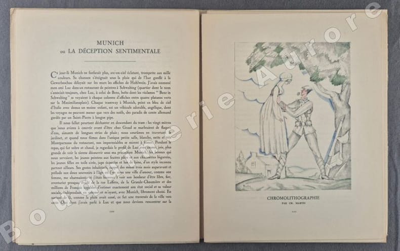 1923 P., Rue de Rivoli, n°222, 1923, 1 vol. in-8 (250 x 198) en feuilles sous couverture imprimée en noir, de IV pp. (numérotées de IX à XII) (sommaire, publicités, explication des planches) - 44 pp. (numérotées de 93 à 136)(texte) - 4 planches coloriées au pochoir.Dos légèrement insolé, très bel exemplaire complet de ses pochoirs par ailleurs.