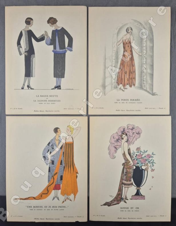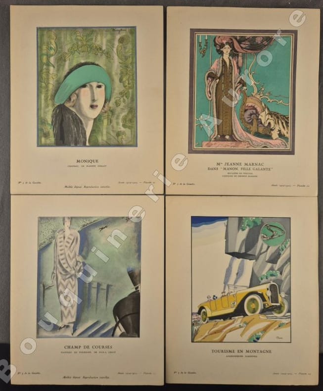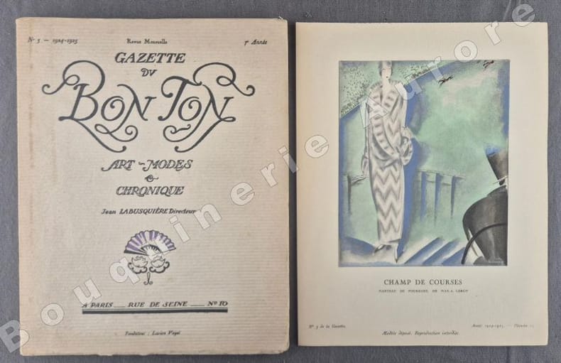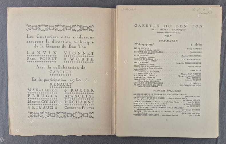 Numéro en grande partie consacré à l'automobile.8 planches hors texte (pl. 17 à 24), coloriées au pochoir, André E. Marty, Georges Lepape, M. Rueg, George Barbier (2), Zinoview, Charles Loupot et Planas pour des créations de Jeanne Lanvin, Max-A. Leroy, Worth, Madeleine Vionnet, Pérugia, Marthe Callot. Articles illustrés en couleurs : De la pudeur (texte de George Barbier, dessins de Charles Martin) - Le Génie de la Montagne (Coriandre, Geoffroy) - Pays de rêve (Maurice Van Moppès) - Gérard et Dolly (Faure-Biguet, Hubert Giron) - Simple envoi (Jacqueline Jacques-Duché) - Eloge de l'automobile (Bauër, Mourgue) - Pélerinage (Pierre Bret, Jean Grangier) - L'automobile en 1900 (Maurice Van Moppès) - Si j'étais automobile (Georges-Armand Masson) - Matinée d'automne (Roger Chastel) - Trois fois un font deux (James de Coquet, Grangier) - Du salon de l'automobile (C. Faroux) - Né sous le signe du Lion, le casque de cuir (Grangier). Numéro bien complet."La Gazette du Bon Ton "Art, Goût, Beauté" est une revue de mode fondée à Paris en 1912 par Lucien Vogel. Elle a paru jusqu'en 1925, avec une interruption de 1916 à 1920, soit 69 livraisons. Elle comprend 573 planches coloriées au pochoir et 148 croquis représentant des modèles de couturiers. Chaque fascicule constitue un album de luxe, imprimé sur beau papier en Cochin, caractère totalement nouveau à l'époque. De nombreux artistes y ont collaboré : Guy Arnoux, Léon Bakst, George Barbier, Benito, Pierre Brissaud, Boutet de Monvel, Umberto Brunelleschi, Chas Laborde, Jean-Gabriel Domergue, Raoul Dufy, Édouard Halouze, Alexandre Iacovleff, Jean Emile Laboureur, Georges Lepape, Charles Loupot, Charles Martin, André-Edouard Marty Ces artistes, inconnus pour la plupart lorsque Lucien Vogel fait appel à eux, imposeront une nouvelle image de la femme. Ils garderont de leur collaboration à cette revue un socle esthétique commun et exposeront leurs uvres sous le nom de Collaborateurs de la Gazette du bon ton. Les planches représentent les robes des créateurs de l'époque : Lanvin, Doeuillet, Paquin, Poiret, Worth, Vionnet, Doucet. Certaines planches ne figurent aucun modèle réel, mais seulement l'idée que l'illustrateur se fait de la mode du jour. [] La naissance de la Gazette du bon ton est un événement dans l'histoire de l'édition de mode. C'est la première revue qui allie souci esthétique, exigence de beauté et d'unité plastique." (Sources Wikipédia). Réf. biblio. : Colas 1202.