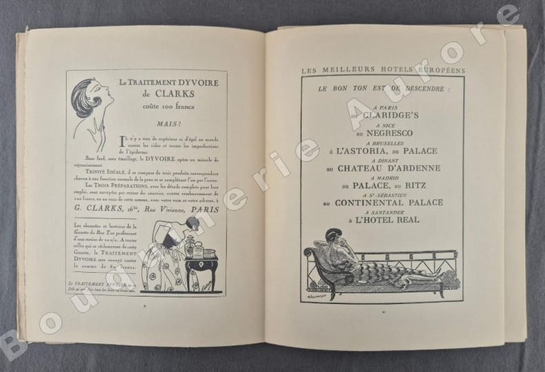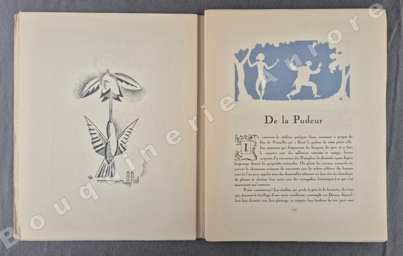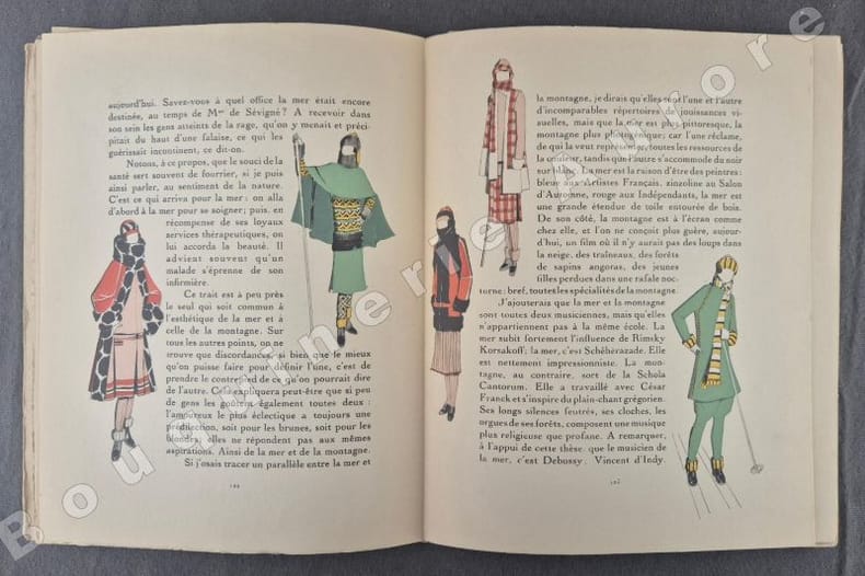 1924 P., Rue de Seine, n°10, 1 vol. in-8 (250 x 198) en feuilles sous couverture imprimée en noir, de IV pp. (numérotées de IX à XII) (sommaire, publicités, explication des planches) - 44 pp. (numérotées de 117 à 160) (texte) - IV pp. (numérotées de XIII à XVI) (publicités) - 8 planches coloriées au pochoir.Dos et bords de la couverture légèrement insolés, petite bande "grasse" sur le bord du plat supérieur, très bel exemplaire complet de ses pochoirs par ailleurs.