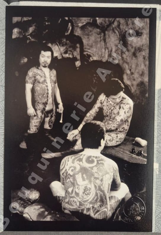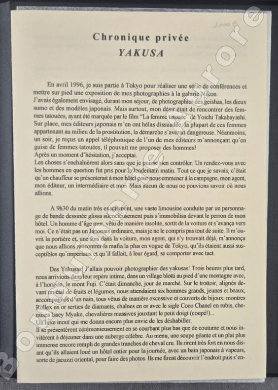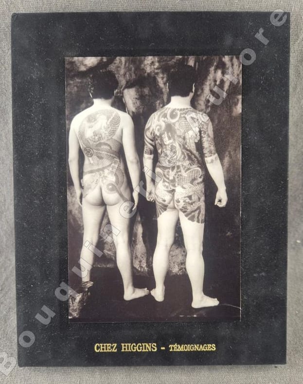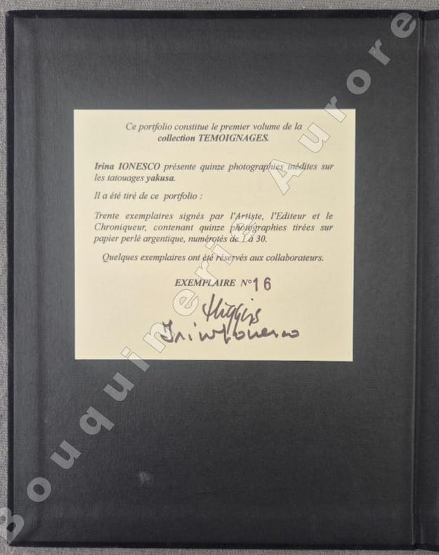 Premier volume de la collection « Témoignages » des éditions Chez Higgins. Irina Ionesco présente 15 photographies inédites sur les tatouages Yakusa.Il a été tiré de ce portfolio 30 exemplaires signés par lArtiste et lEditeur au justificatif, contenant 15 photographies tirées sur papier perlé argentique (N°16).Toutes les photographies possèdent un cachet rouge aux symboles japonais et la signature de lartiste au feutre noir au verso, ainsi quun timbre sec rond de léditeur en coin du recto.