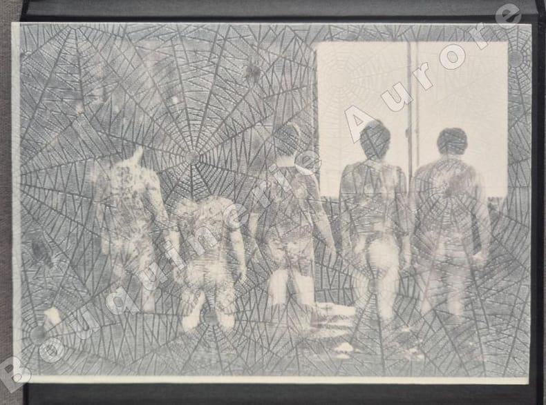 2000 P., Chez Higgins, s.d. (ca 2000), 1 portfolio 202 x 155 mm sous chemise de velours noir, photographie en noir et blanc contrecollées au plat supérieur et étui cartonné recouvert de papier noir, de (2) ff. (présentation du contexte de la prise de vue des clichés de lartiste) 15 photographies en n/b (188 x 125 mm chacune), toutes protégées par des serpentes en papier cristal à effet « toile daraignée ».Parfait exemplaire.