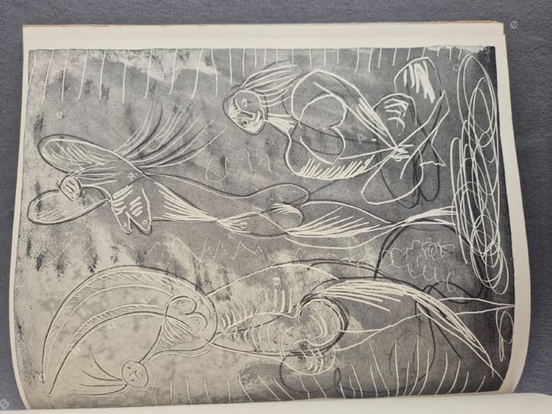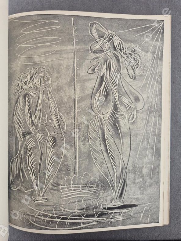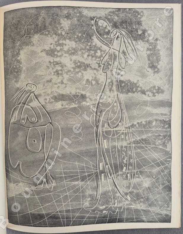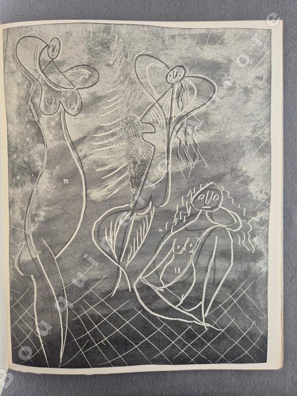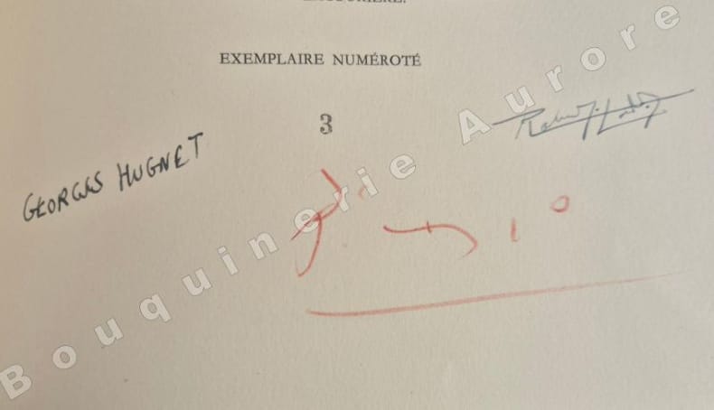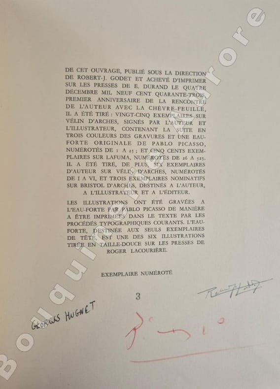 6 illustrations hors-texte gravées à leau-forte par Pablo Picasso et tirées en taille-douce sur les presses de Roger Lacourière.Tiré à 534 exemplaires, 1 des 25 de tête sur vélin dArches (N°3) signé par Georges HUGNET, Pablo PICASSO (au crayon de couleur rouge) et Robert-J. GODET au justificatif. ATTENTION : les exemplaires de tête devaient normalement comporter une suite en 3 couleurs des gravures et une eau-forte originale de Pablo Picasso, non présentes ici.Réf. biblio. : Monod, 6121.