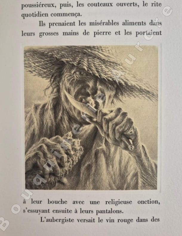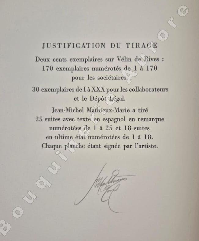 Tiré à 200 exemplaires sur vélin de Rives, 1 des 170 pour les sociétaire (ici le N°112 imprimé pour Monsieur Patrice Vergé), signé au crayon par l'illustrateur au justificatif.12 pointes-sèches originales de Jean-Michel Mathieux-Marie, tirées par lui-même sur chine appliqué (7 entêtes, 3 in-texte, 1 pleine-page, 1 cul-de-lampe).
