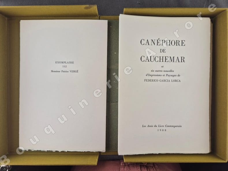 1988 P., Les Amis du Livre Contemporain, 1988, 1 vol. in-4° (280 x 190 mm) en feuilles sous couverture verte rempliée, boîte à chasse toilée olive éditeur, de 65 pp. - (2) ff. (achevé d'imprimer et justificatif de tirage).Très bel exemplaire.