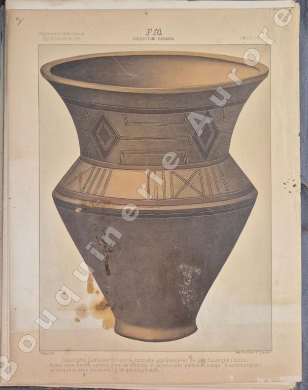 Nouvelle série, fascicule complet du texte avec illustrations en noir et de toutes les planches en chromolithographie requises (planches 123 à 138 avec une 125 bis imprimée en bistre, 2 planches dépliantes (124 et 125) et les planches 133 & 134 sur la même feuille).Ces planches reproduisent des harnachements, un bridon en fer, des torques, bracelets et fibules en bronze, des armes d'une sépulture gauloise, des poteries gauloises et gallo-romaines.Il est joint à l'exemplaire une carte de visite de l'auteur, datée du 7 juin 1892, avec texte manuscrit : "[M. Frédéric Moreau] ayant été avisé par Monsieur Barabant, que dans l'intérêt de la Science et de l'histoire, il pourrait compter sur l'aide de Monsieur Hullot, chef de section, pour sauver les objets d'antiquité, que les travaux du chemin de fer mettraient à découvert ; le recommande, à cet effet, à la sollicitude de Monsieur Hullot, et met sous ses yeux, en le priant de l'accepter, un exemplaire de l'emploi qu'il fait chaque année de ces intéressantes épaves". "Frédéric Moreau, figure de larchéologie mérovingienne dans lAisne, publia une série de fascicules illustrés par Jules Pilloy, connus sous le nom dAlbum Caranda. Cest un document rare et dune grande richesse. (...) Avant 1914, la Picardie, et en particulier le département de lAisne sont à lavant garde de la recherche archéologique mérovingienne. Dès le milieu du XIXe s., de nombreuses sociétés archéologiques furent créées. En 1851, le Musée de Laon est ouvert et cest entre 1870 et 1914 que furent explorées la grande majorité des nécropoles mérovingiennes aujourdhui connues. Un commerce lucratif d"Antiquités" vit le jour. Des chercheurs comme Jules Pilloy, Frédéric Moreau entreprirent de nombreuses fouilles.Frédéric Moreau (1798-1898), notable en retraite dans le canton de Fère-en-Tardenois, entreprit en 1873 dans lAisne des fouilles archéologiques quil poursuivit pendant 20 ans. Aidé chaque jour douvriers, damis et de membres de sa famille, il aurait fouillé selon ses estimations environ 12000 tombes mérovingiennes, et accumulé une importante collection.Frédéric Moreau fit considérablement progresser larchéologie mérovingienne en livrant une documentation énorme. Il rédigea 24 volumes de procès-verbaux de fouilles.Il confia à Jules Pilloy (1830-1922) les pièces les plus intéressantes de sa collection que ce dernier reproduisit grandeur nature et en couleurs. Pilloy était un des meilleurs archéologues et il parcourut le département de lAisne au gré de changements de postes professionnels. Il avait du goût pour le dessin, prit des cours de peinture et réalisa méticuleusement les planches de nombreux ouvrages archéologiques.Frédéric Moreau fit paraître de 1877 à 1893 une série de fascicules non paginés associant les planches de Pilloy à un commentaire succint. Lensemble est généralement désigné sous le nom dAlbum Caranda fut édité à compte dauteur à 300 exemplaires qui furent tous donnés par Frédéric Moreau. Il distribua également une partie de sa collection à des musées, parents ou amis. Le reste fut légué à sa mort (il était dans sa 101ème année!) au Musée des Antiquités Nationales de Saint-Germain-en-Laye". (Sources : Musée des Temps Barbares, Parc archéologique de Marle, Aisne).