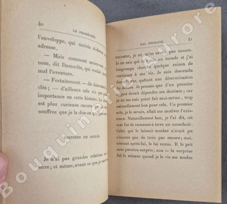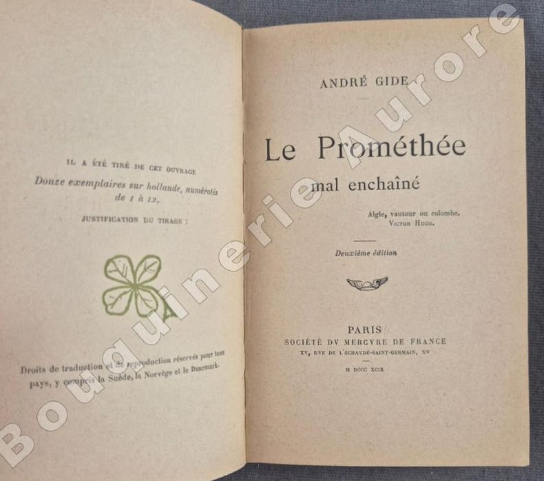 Paris La Nouvelle Revue française 1920. Sans pagination. In-8. Broché. État correct. 1 volume. "Mal enchaîné, en effet, puisque le voici à paris en 1899, débarquant du Caucase. Et puis, mal enchaîné, parce que cet amoureux des hommes n'a plus besoin de chaînes - il est devenu amoureux de son oiseau ; il le nourrit, dans l'espoir que ce vautour déplumé qui ressemble à une conscience deviendra le bel aigle du progrès, de l'idéal, de l'essor. À ce régime, Prométhée dépérit. Même, il en mourrait si, à la suite d'une conférence qu'il a donnée sur le thème a chacun son aigle, son ami Damoclès n'était mort d'y avoir trop cru. Sur la tombe fraîche, Prométhée improvise une causerie, bien différente de la première, et où il vante le destin de Moelibée, l'homme heureux qui s'en va, nu, vers un bonheur champêtre. Après l'enterrement, il invite ses amis à manger avec lui l'aigle bien gras dont il a seulement gardé les plumes".TIRAGE LIMITÉ à 765 exemplaires numérotés sur papier vélin blanc Lafuma-Navarre. Celui-ci est un de ces exemplaires numérotés.