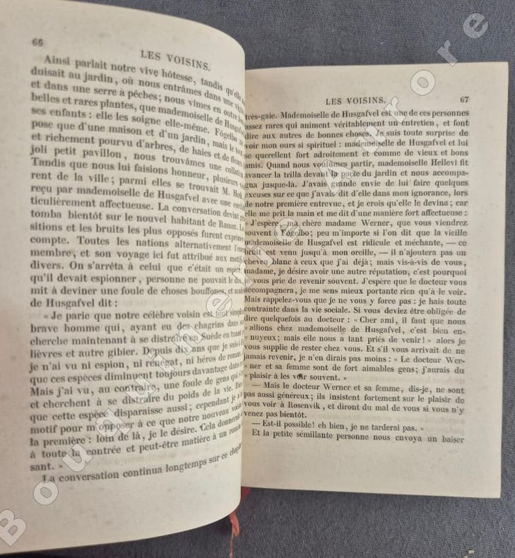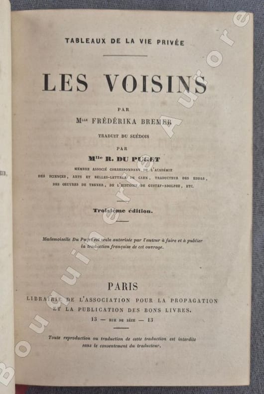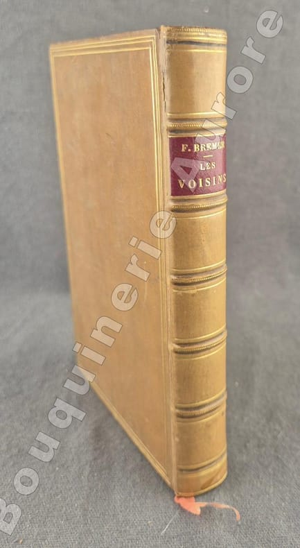 Première édition française dans la traduction de Rosalie du Puget (1795-1875) comme la plupart des ouvrages de la femme de lettres suédoise à l'origine du féminisme scandinave Fredrika Bremer (1801-1865) traduits en français dans la seconde moitié du XIXème siècle dont Les Voisins.« A partir de 1830, l'âge de la prose commence en Suède. Les auteurs de cette époque ont l'ambition de créer un roman de mœurs suédois. Fredrika Bremer donne ses "Techningar utur hvardagslifvet" (Tableaux de la vie privée, 1828-31), "Grannarne" (Les Voisins, 1837), "Hemmet" (Le Foyer domestique, 1839), récits qui peignent, avec un humour un peu mièvre, la vie de la moyenne et grande bourgeoisie suédoise de l'époque. (…) Fredrika Bremer est considérée comme la première féministe de la littérature suédoise, et une comparaison entre ses romans et ceux de George Sand, qui appartient exactement à la même époque, est révélatrice. Ce que Fredrika Bremer réclame — avec bien des ménagements — c'est la possibilité pour les femmes de s'instruire et de gagner leur vie, afin de ne pas être obligées de se marier uniquement pour trouver leur subsistance. Chez Mlle Bremer, il n'est pas question des droits de la passion, et l'amour, même le plus scrupuleusement légitime, est pudiquement voilé chez notre féministe suédoise. (Elle admirait cependant beaucoup la Consuelo de George Sand).Très bon esemplaire. Quelques pâles rousseurs, dos légèrement passé.Wingard Kristina, Le dix-neuvième siècle suédois : courants littéraire et traditions de recherche. In: Romantisme, 1982.