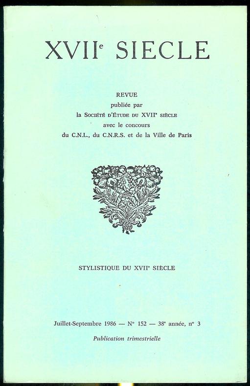 Numéro 152 de juillet-septembre 1986, 38e année N°3, de la revue "XVIIe siècle", revue publiée par la Société d'Etudes du XVIIe Siècle, avec le concours du C.N.L., du C.N.R.S. et de la ville de Paris.Publication trimestrielle.Bel exemplaire.
