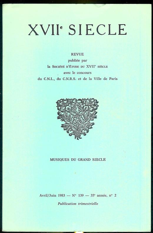 Numéro 139 de Avril-juin 1983, 35e année N°2, de la revue "XVIIe siècle", revue publiée par la Société d'Etudes du XVIIe Siècle, avec le concours du C.N.L., du C.N.R.S. et de la ville de Paris.Publication trimestrielle.Bel exemplaire.