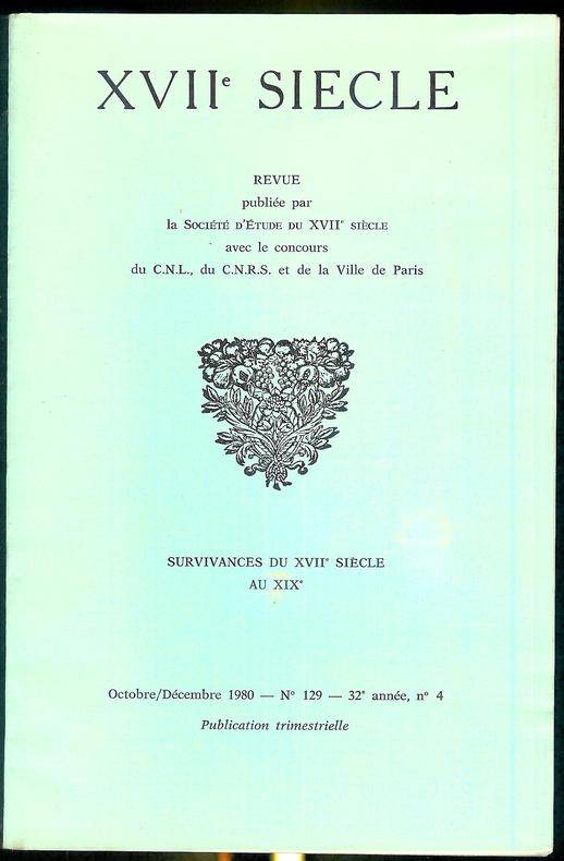Numéro 129 de octobre-décembre 1980, 32e année N°4, de la revue "XVIIe siècle", revue publiée par la Société d'Etudes du XVIIe Siècle, avec le concours du C.N.L., du C.N.R.S. et de la ville de Paris.Publication trimestrielle.Bel exemplaire.